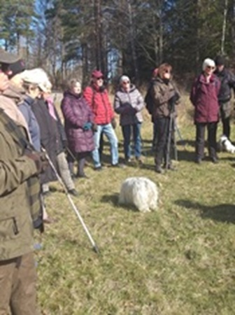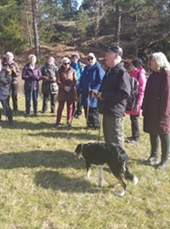 Torsdagen den 10 april var 36 medlemmar från SPF Seniorerna i Trosa ute på en vandring. Vi var lite oroliga för vädret, man hade varnat för lättare snöfall, kallt och blåst. Men solen sken på oss som vanligt (vi har alltid tur med vädret) men vindarna var kalla så mössan åkte på. Lasse Bäck guidade oss i hagarna nere vid Krymla och han hade mycket intressent att berätta för oss. Vi fick uppleva stora flockar med hjortar som betade. Dom tog ingen notis om oss utan fortsatte att äta. Stora blåa mattor med blåsippor och även en och annan vitsippa hade börjat blomma.