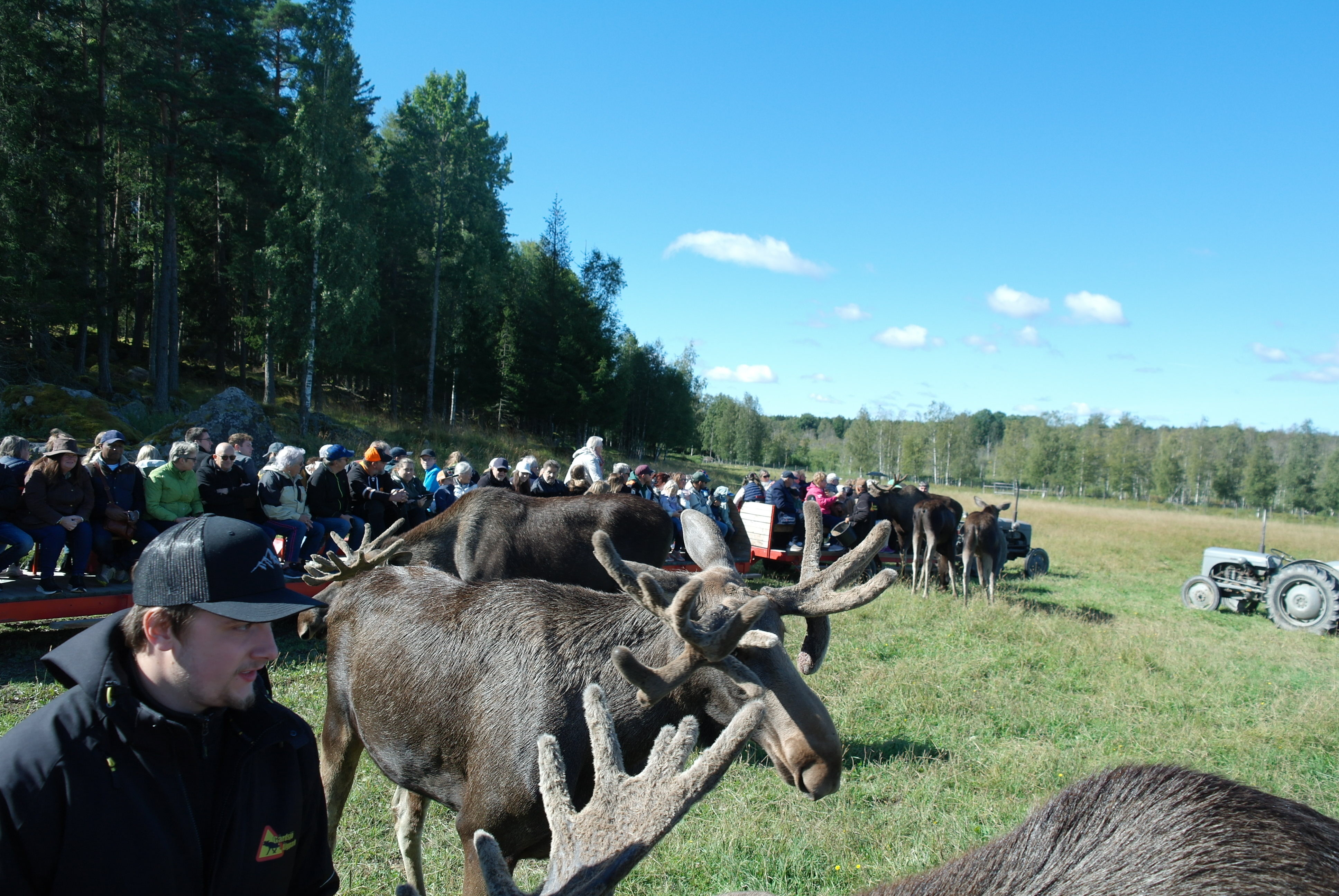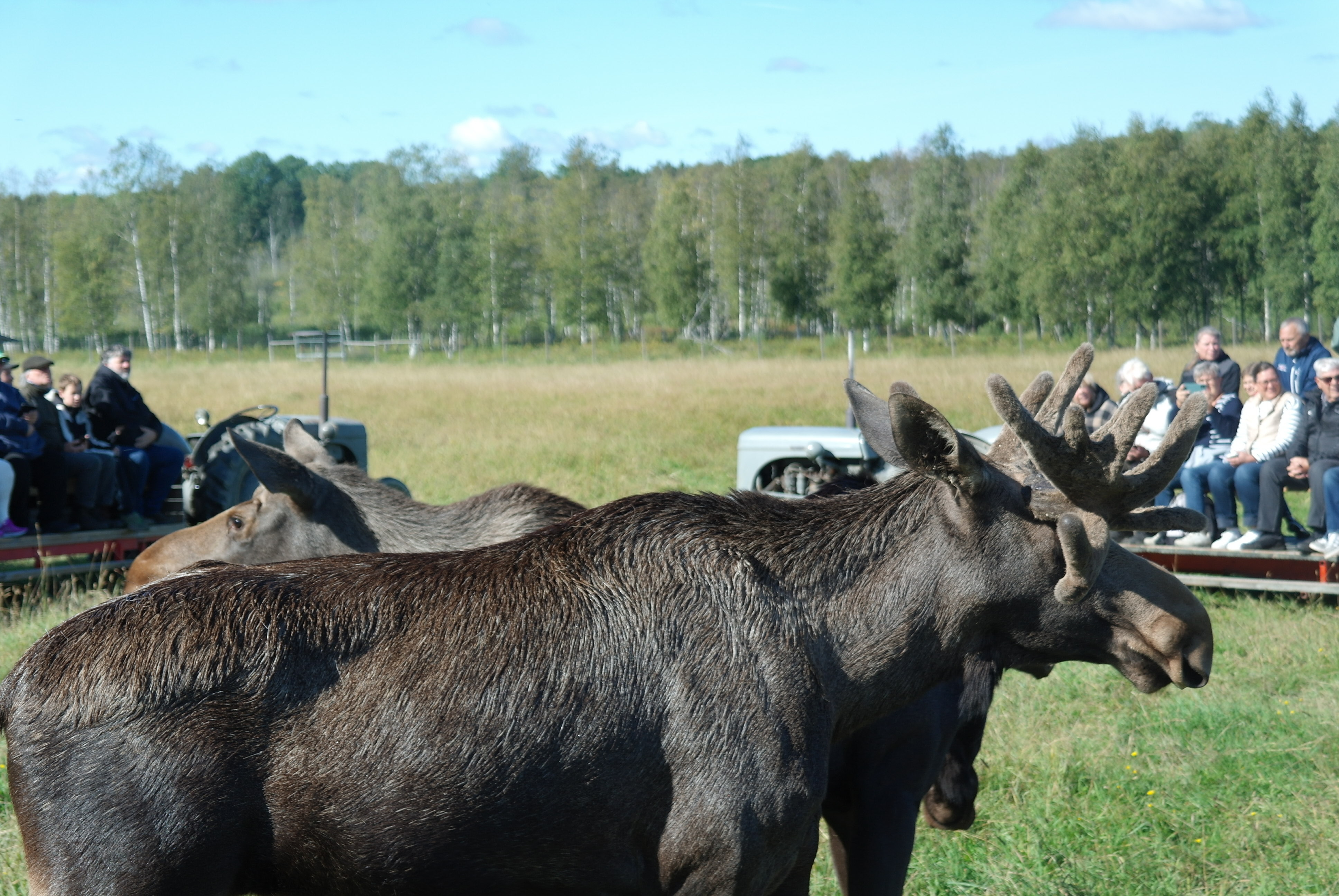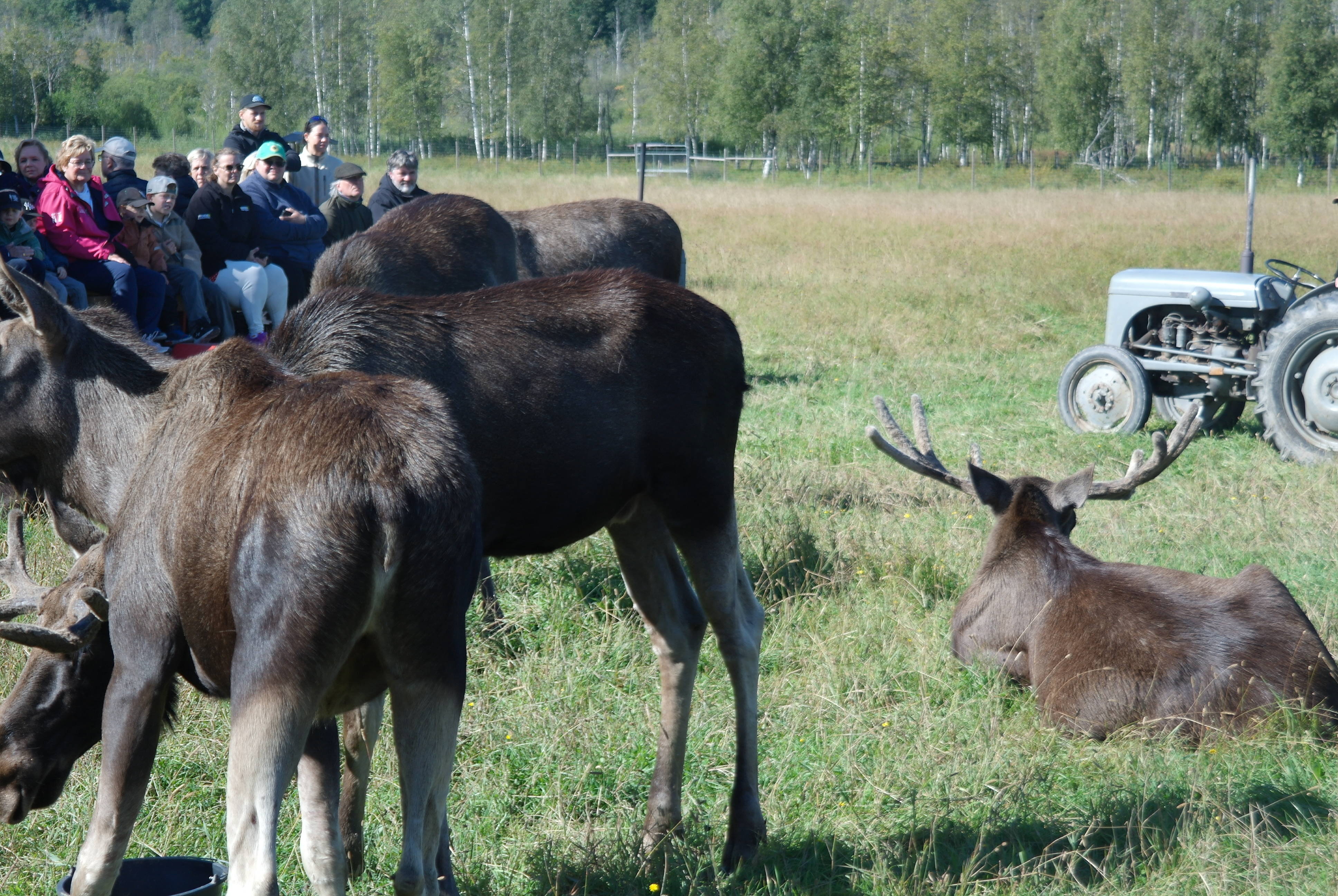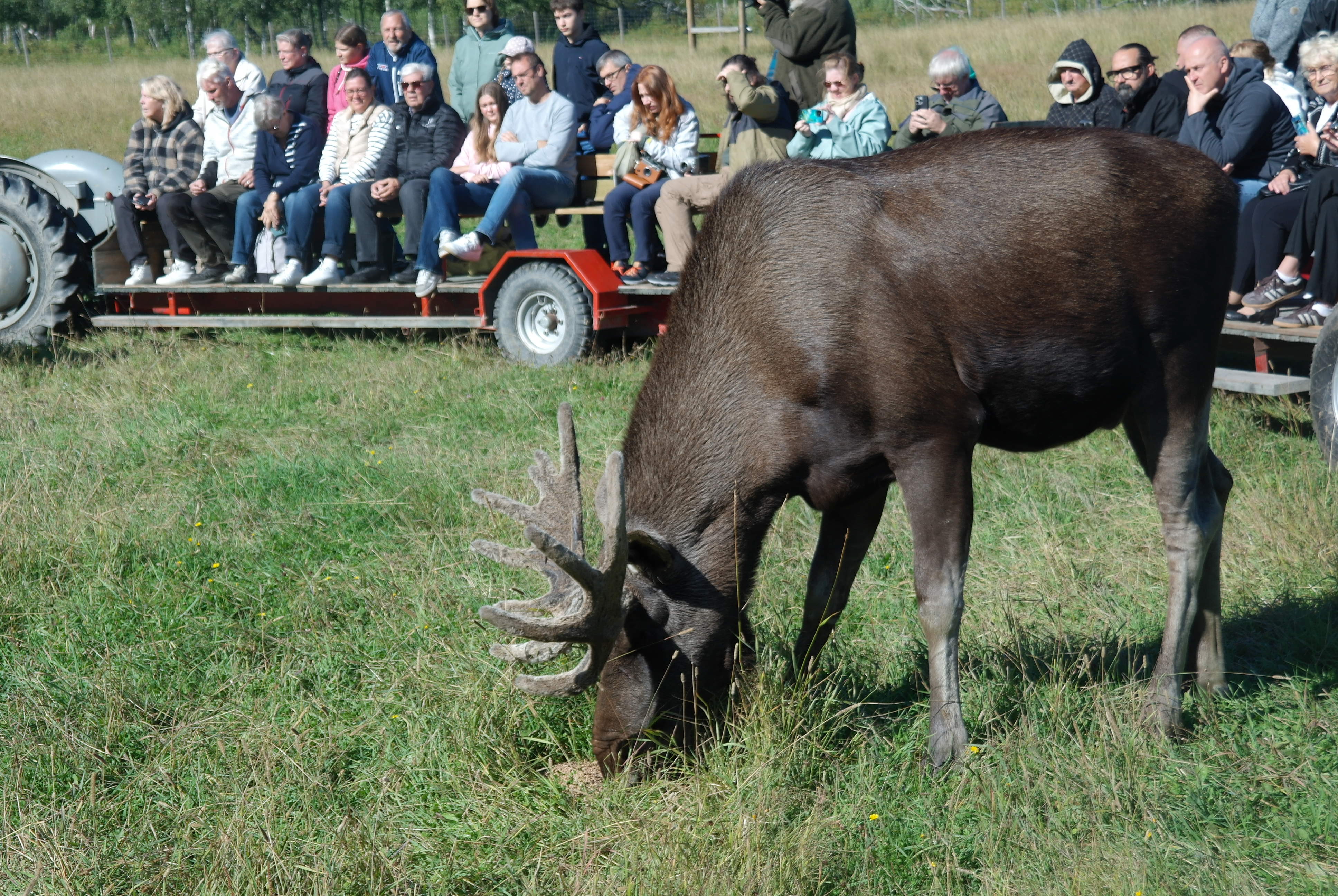 Vid framkomsten var det kaffe och smörgås innan vi blev skjutsade på traktordragna vagnar, som vi inte fick kliva av under hela tiden vi var bland älgarna. Först var vi bland älgtjurar, den dagen 7 stycken i varierande åldrar och med personliga namn. De blev inmatade till vagnarna där de kom så nära att man kunde klappa dem, men absolut inte på baken.