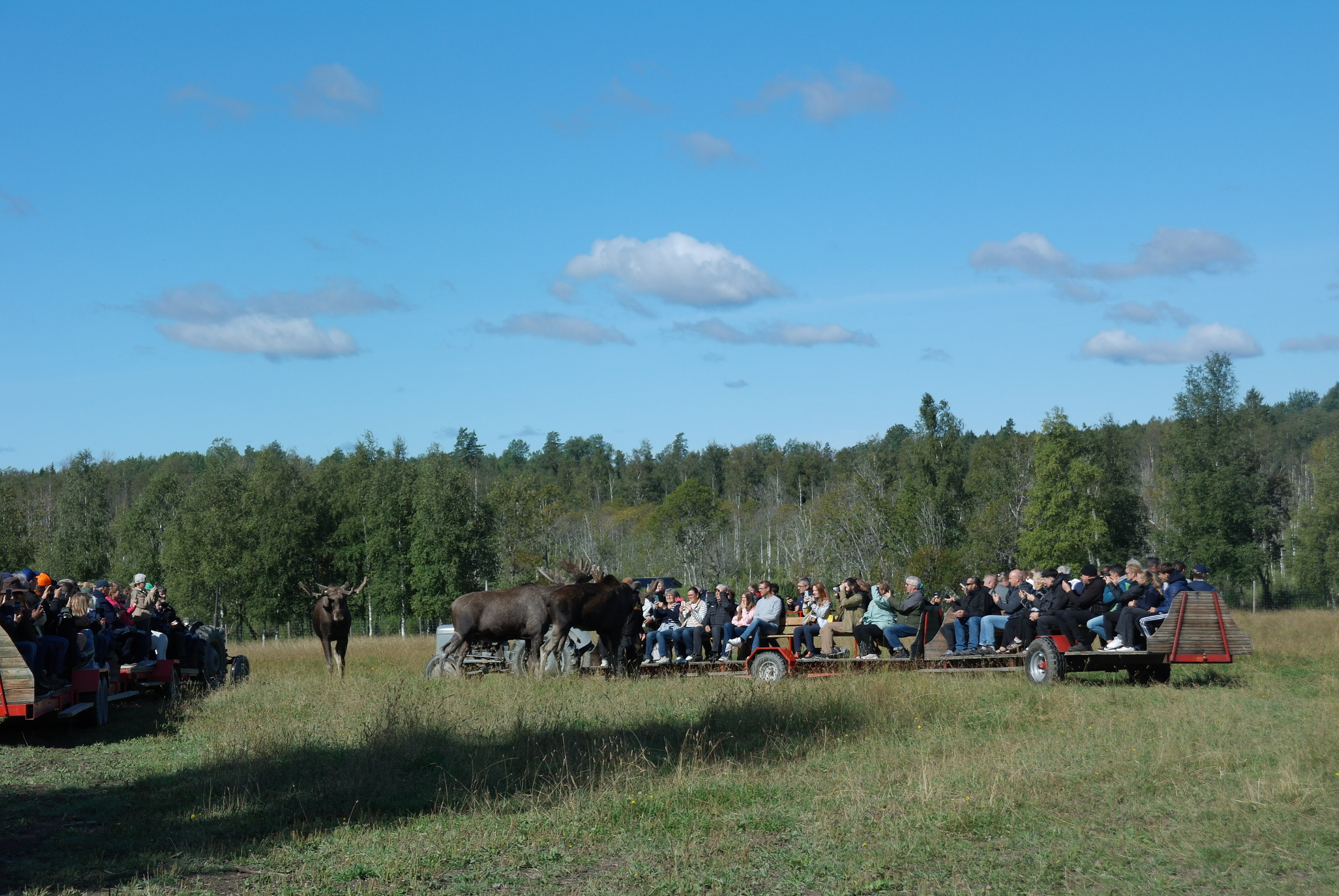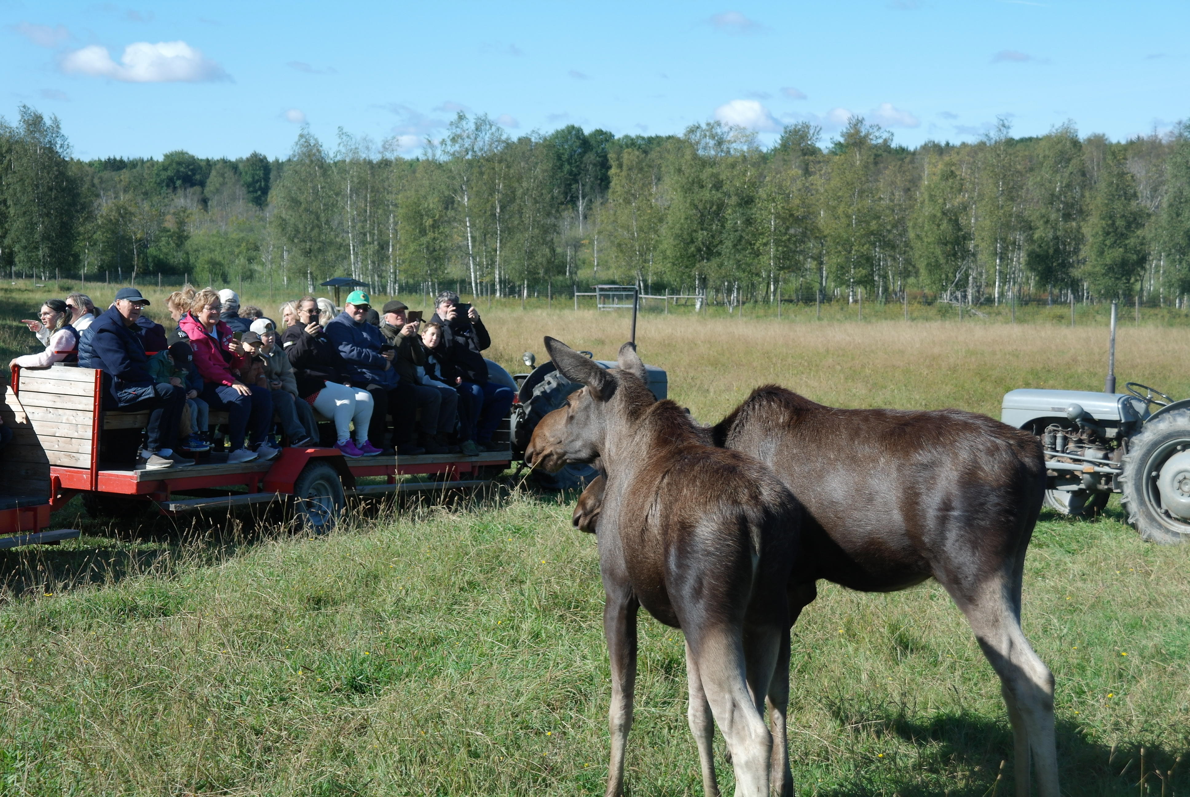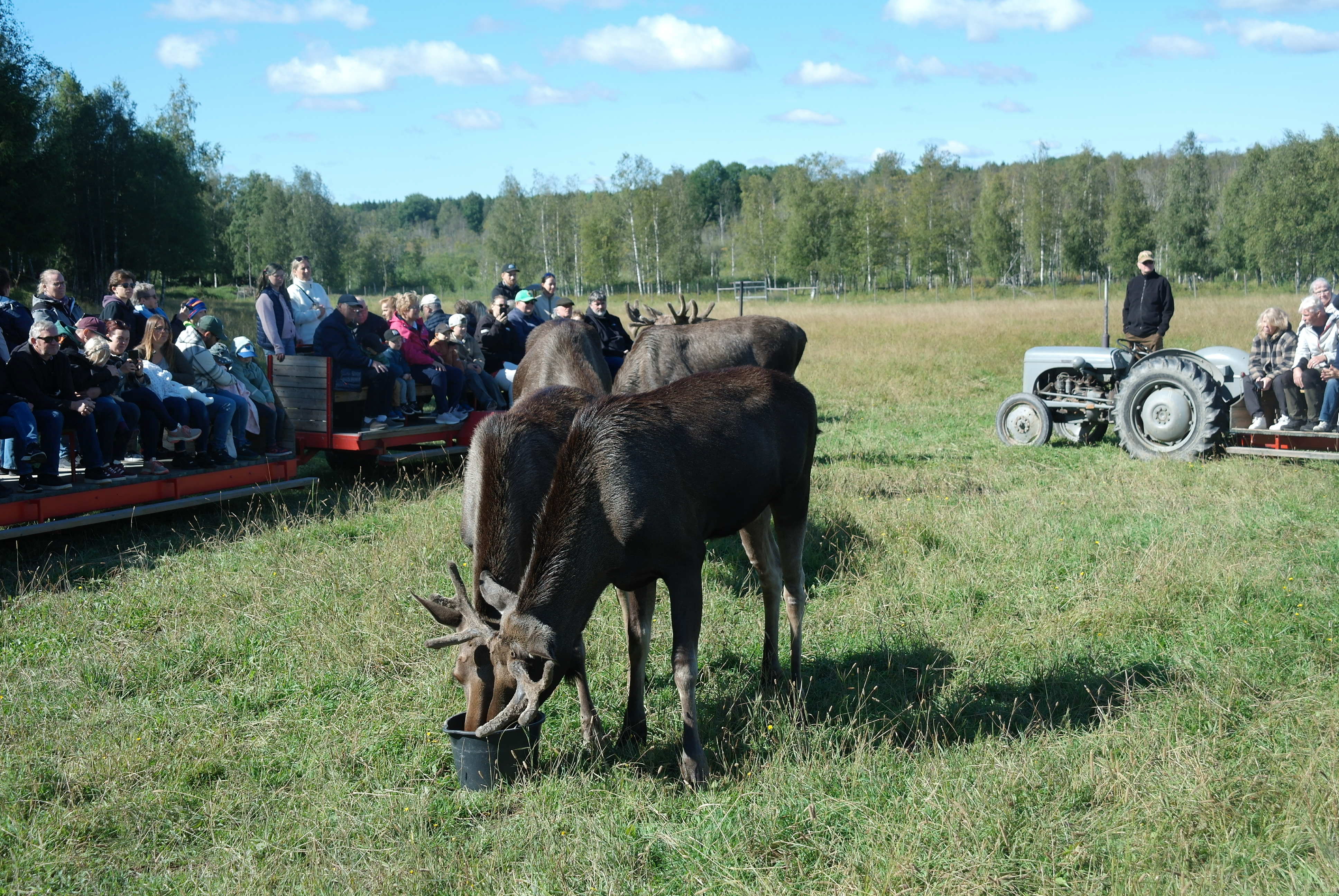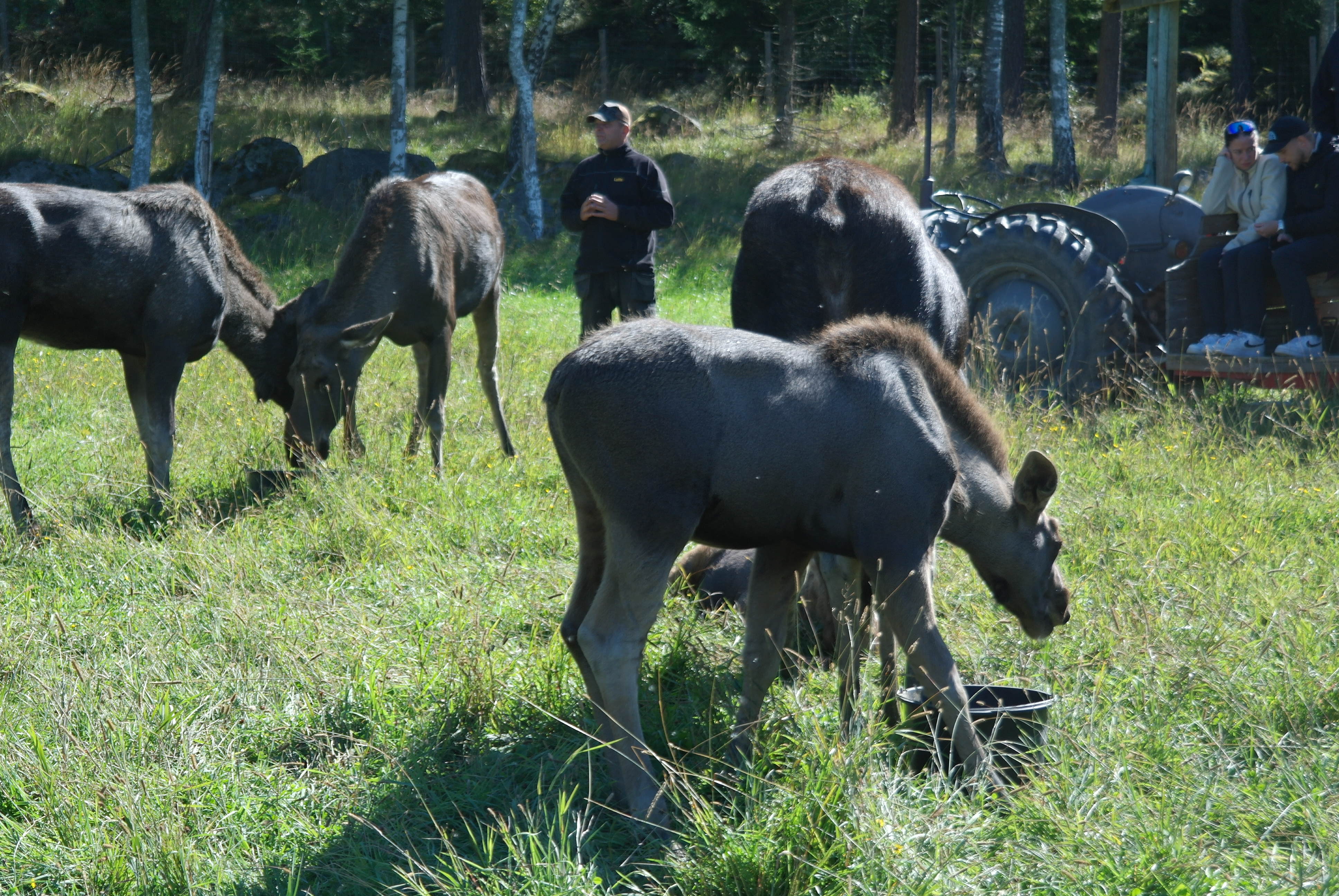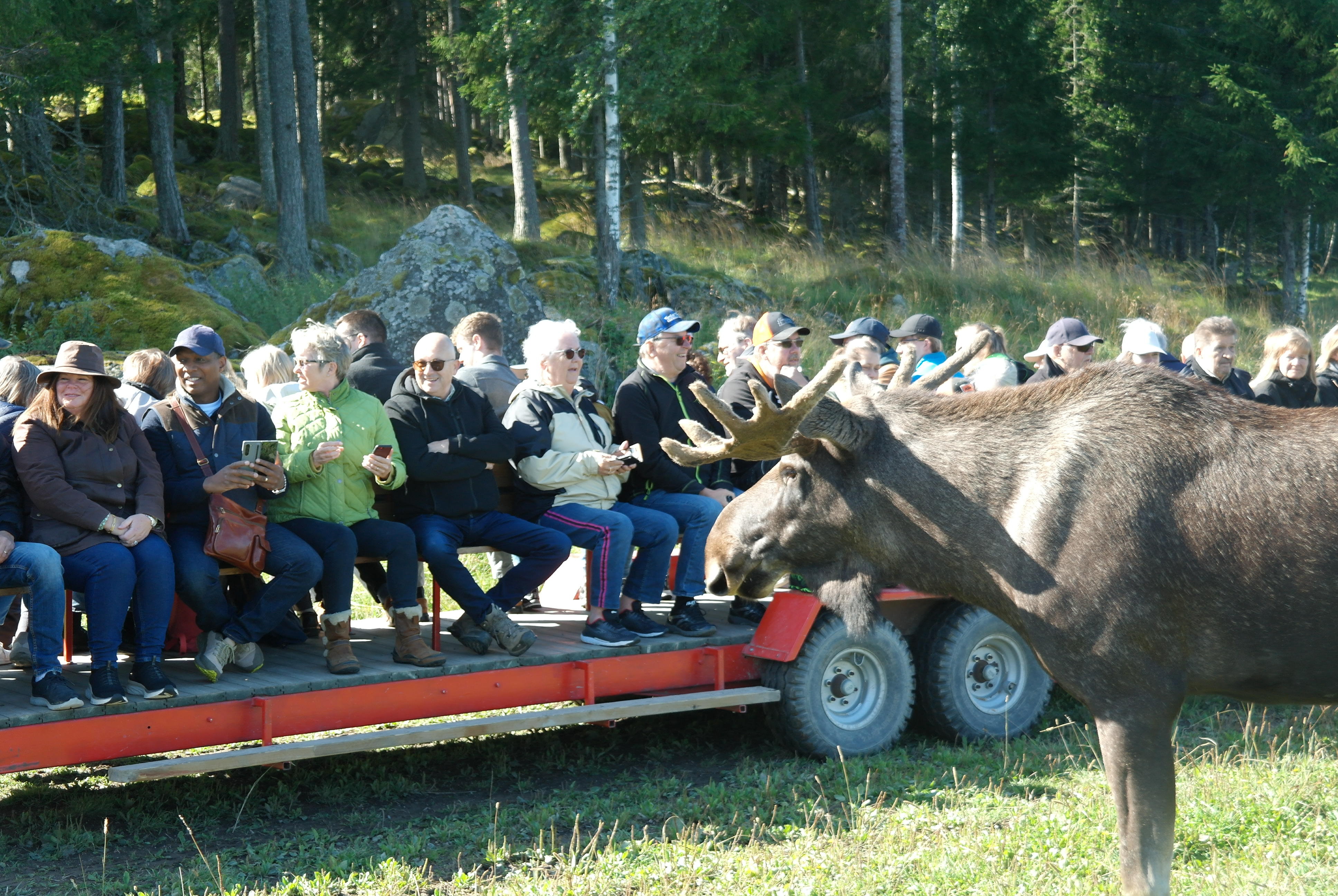 Vid framkomsten var det kaffe och smörgås innan vi blev skjutsade på traktordragna vagnar, som vi inte fick kliva av under hela tiden vi var bland älgarna. Först var vi bland älgtjurar, den dagen 7 stycken i varierande åldrar och med personliga namn. De blev inmatade till vagnarna där de kom så nära att man kunde klappa dem, men absolut inte på baken.