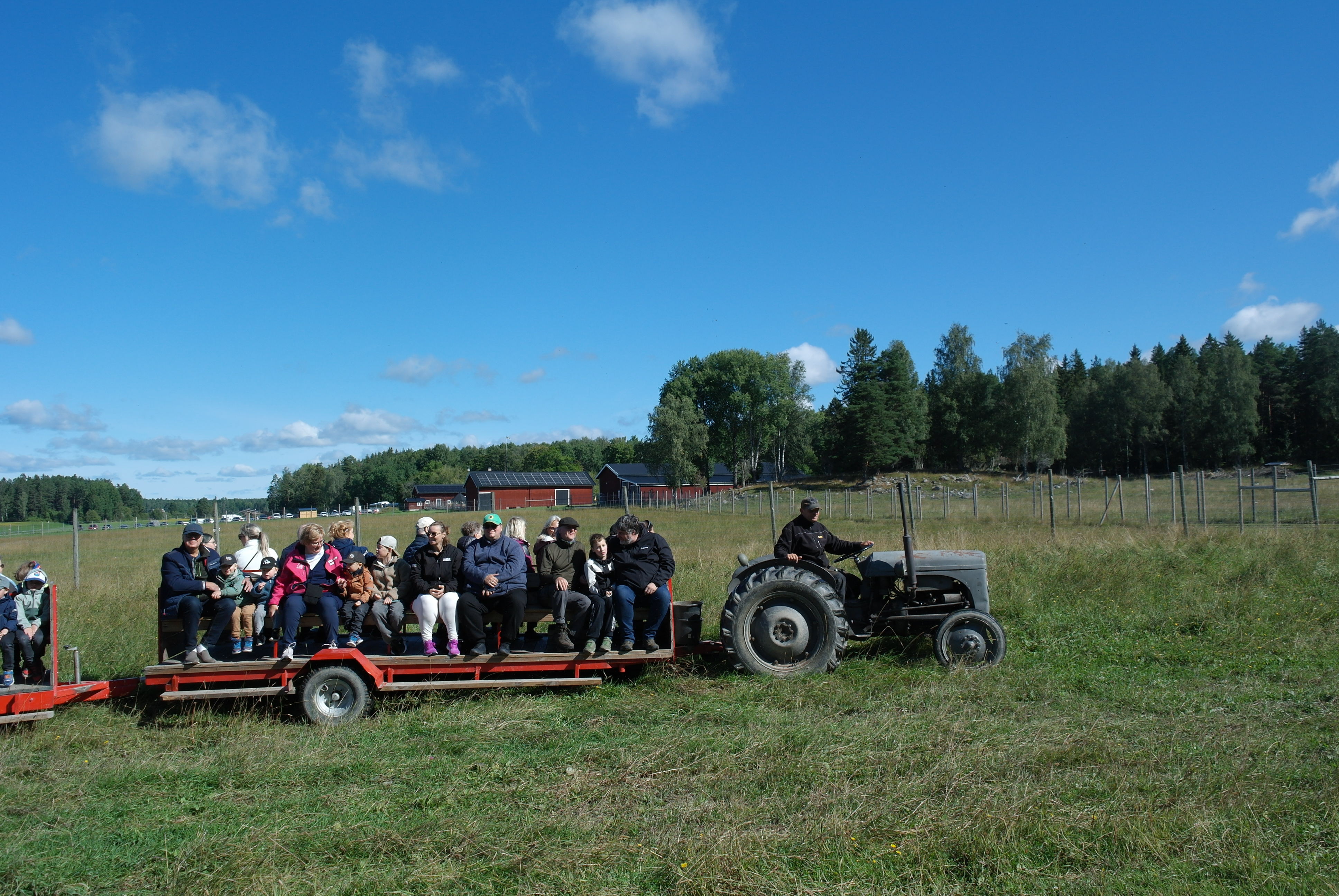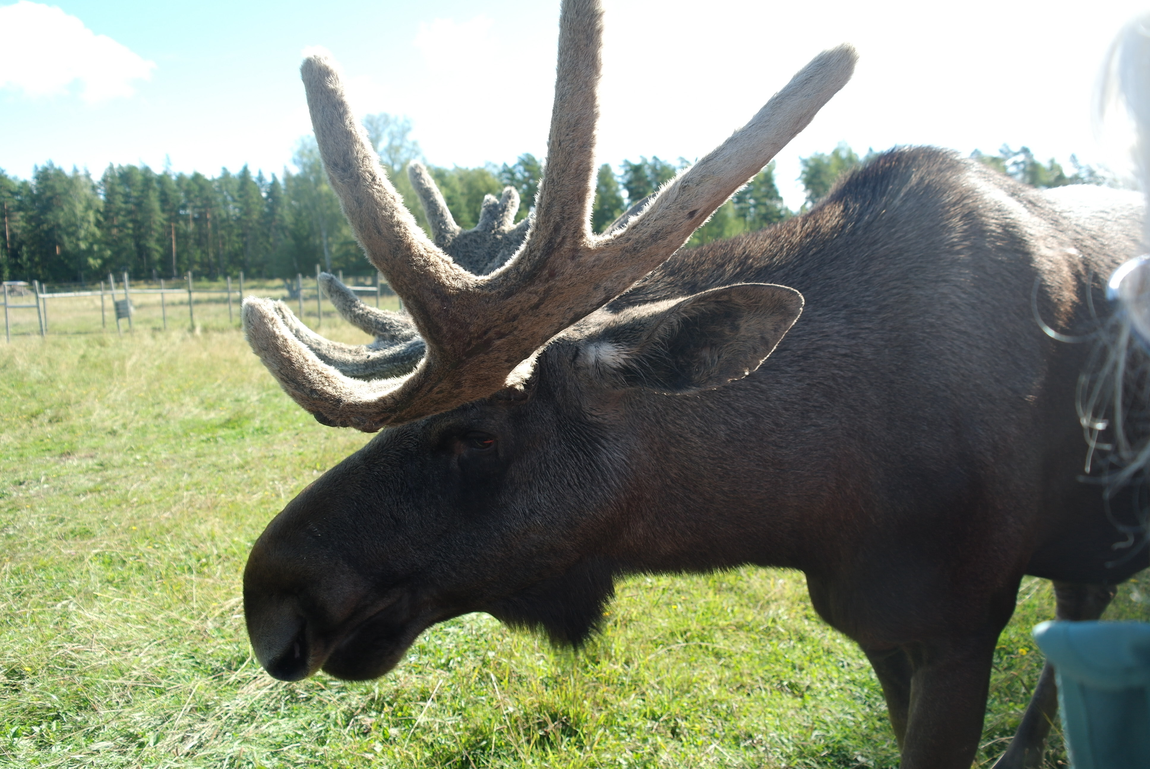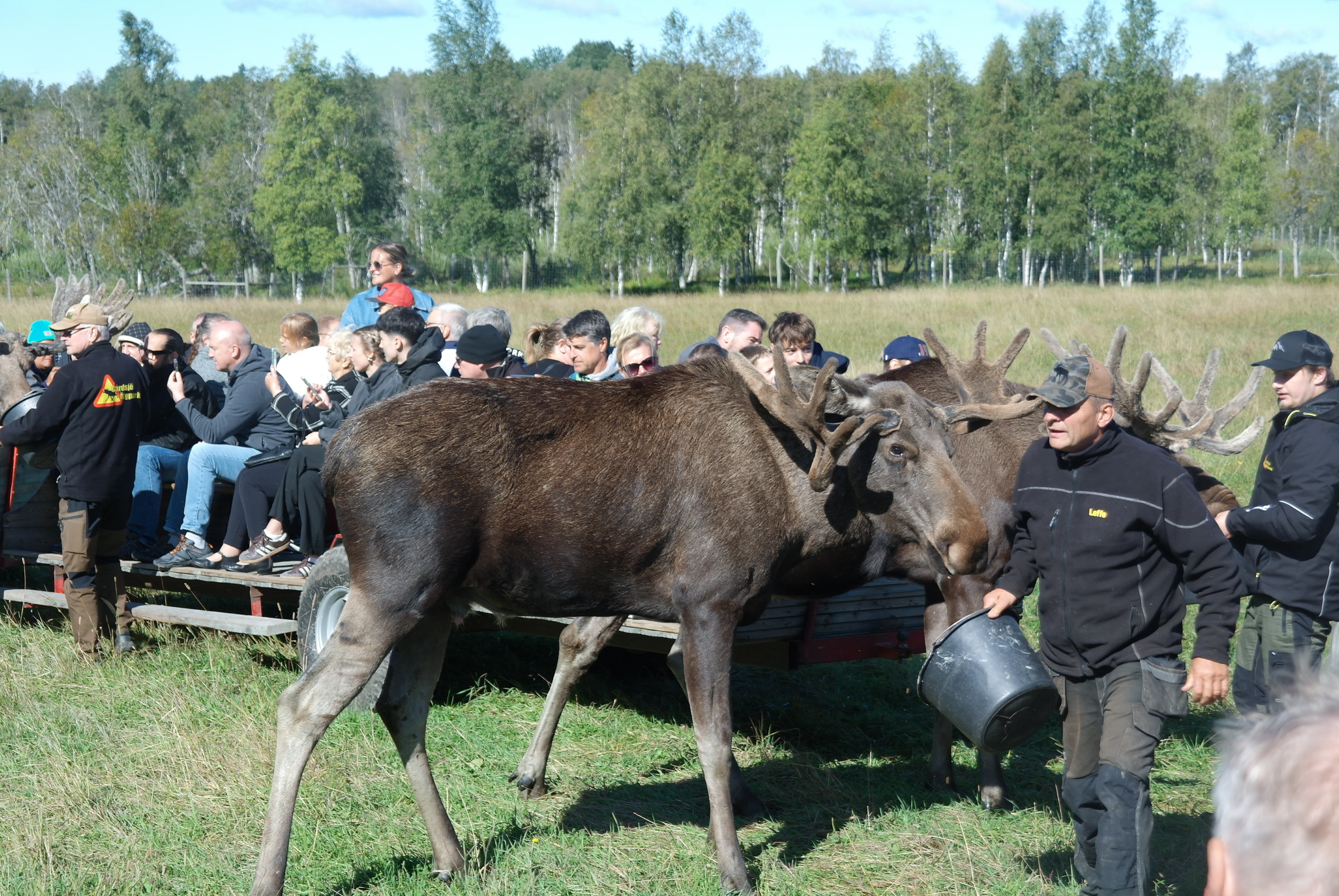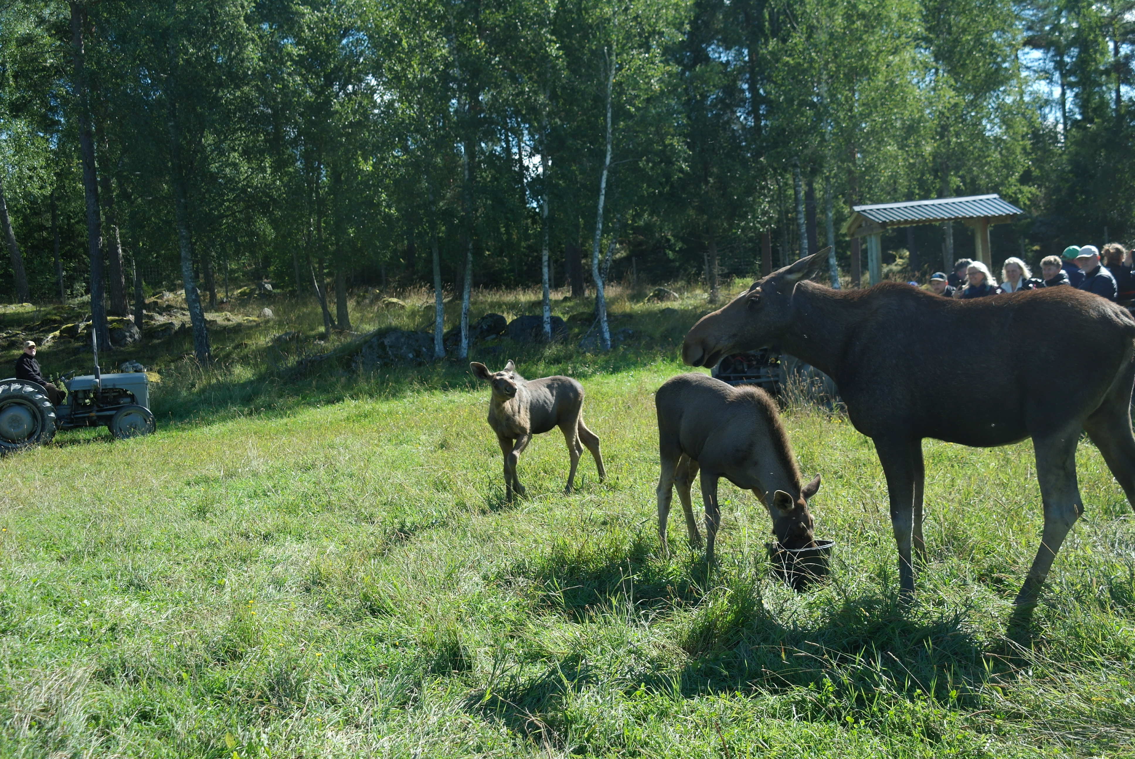 Vid framkomsten var det kaffe och smörgås innan vi blev skjutsade på traktordragna vagnar, som vi inte fick kliva av under hela tiden vi var bland älgarna. Först var vi bland älgtjurar, den dagen 7 stycken i varierande åldrar och med personliga namn. De blev inmatade till vagnarna där de kom så nära att man kunde klappa dem, men absolut inte på baken.