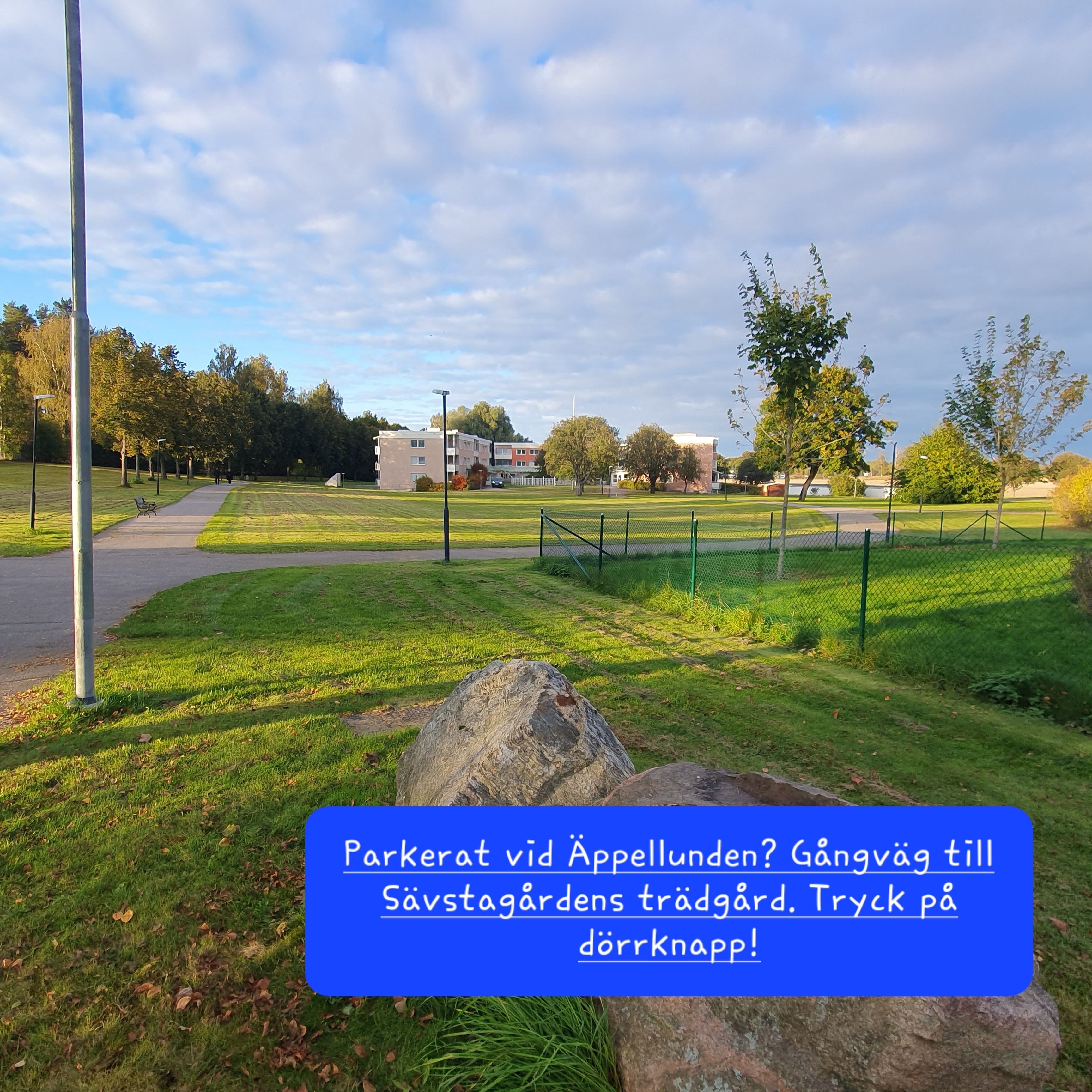 Du kommer från gång- och cykelvägen till trädgården på Sävstagården.