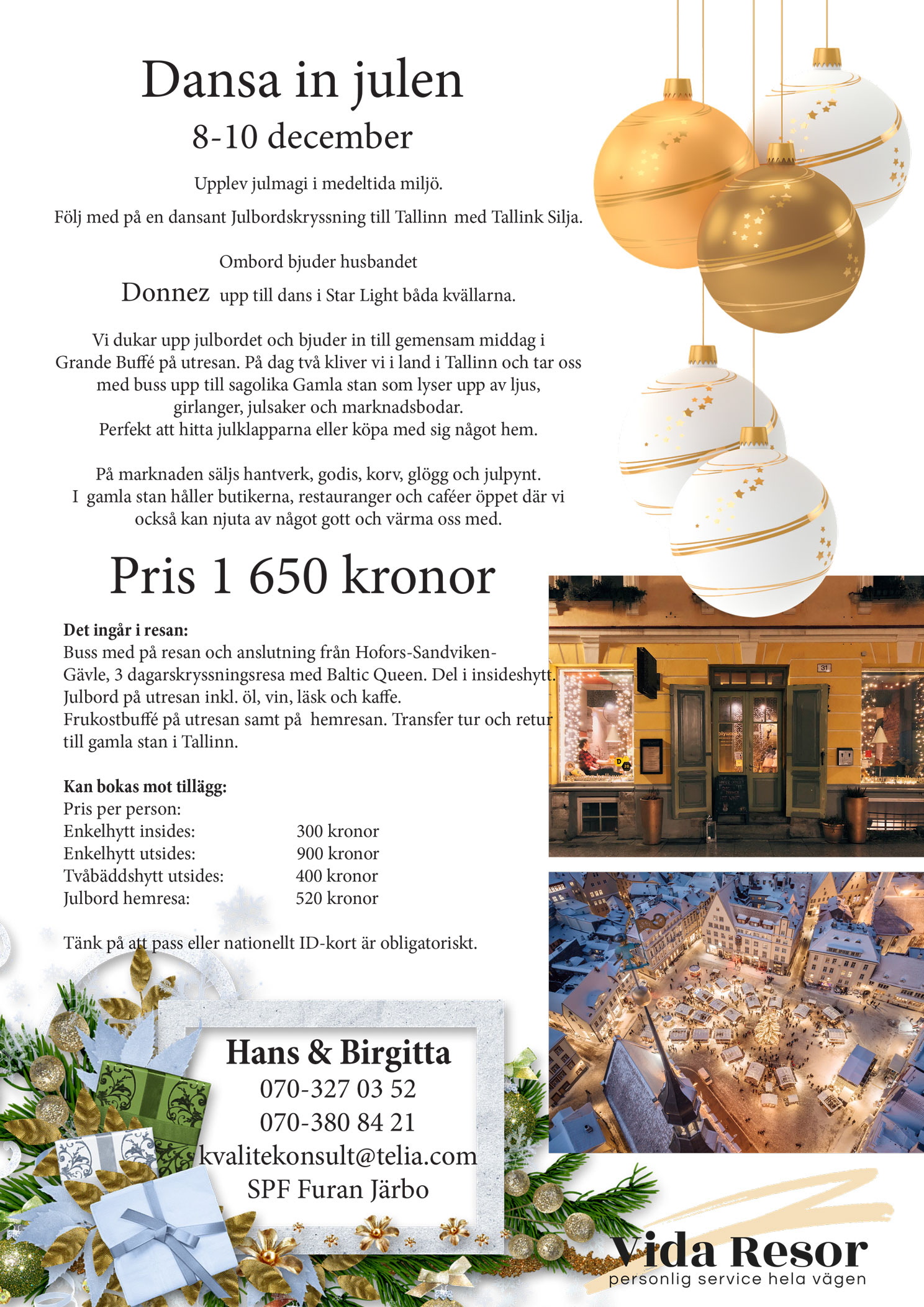 Följ med på en dansant julbordskryssning till Tallinn med Tallink Silja. Under båda kvällarna ombord dansar vi till Donnez orkester. Under dagen får vi besöka Julmarknaden i Tallinn, samt göra inköp av dryckesvaror.