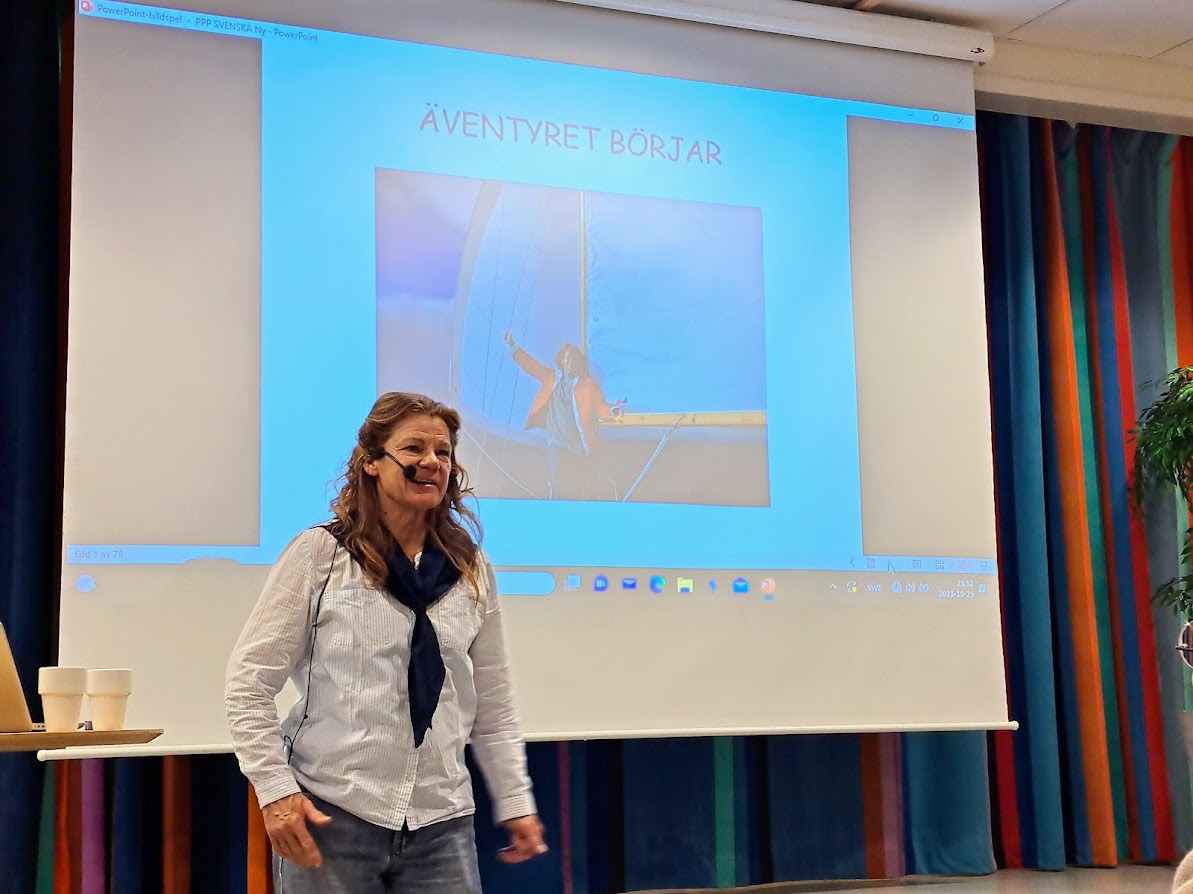 Sen var det dags för Kajsa Kavat i skepnad av ensamseglaren Eva Kullgren att berätta om sina bravader på Medelhavet, Atlanten och diverse floder i såväl Europa som Sydamerika. Oj, som hon har tagit sig fram för egna segel och med hjälp av tillfälliga och hyggliga bekantskaper längs seglatsen! Man flämtade, utmattad av den i överkant långa framställningen, den gick i hamn efter en timme…