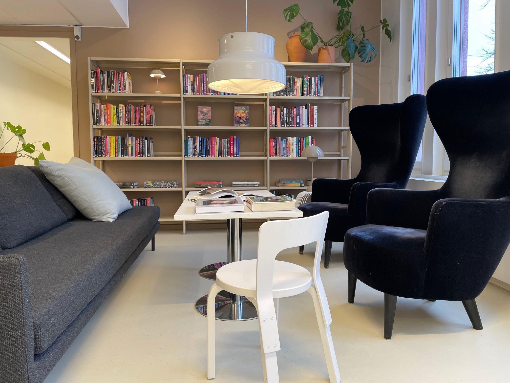 Biblioteket ligger en trappa upp i Fältöverstens galleria.