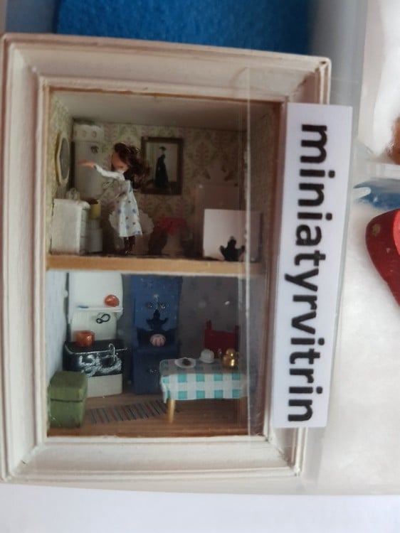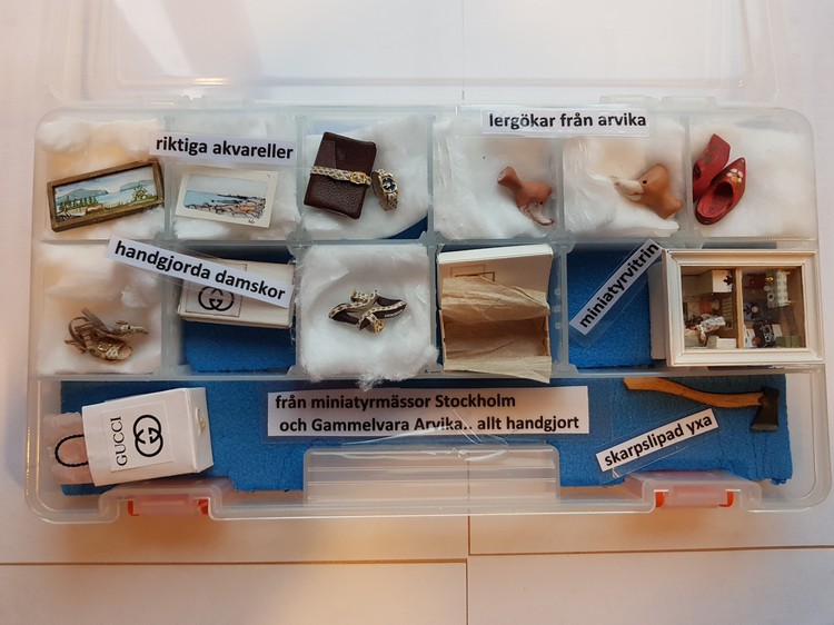 Här en samling av diverse ting. Bl.a riktiga akvareller, lergökar, handgjorda damskor, en miniatyrvitrin med innehåll, mm.