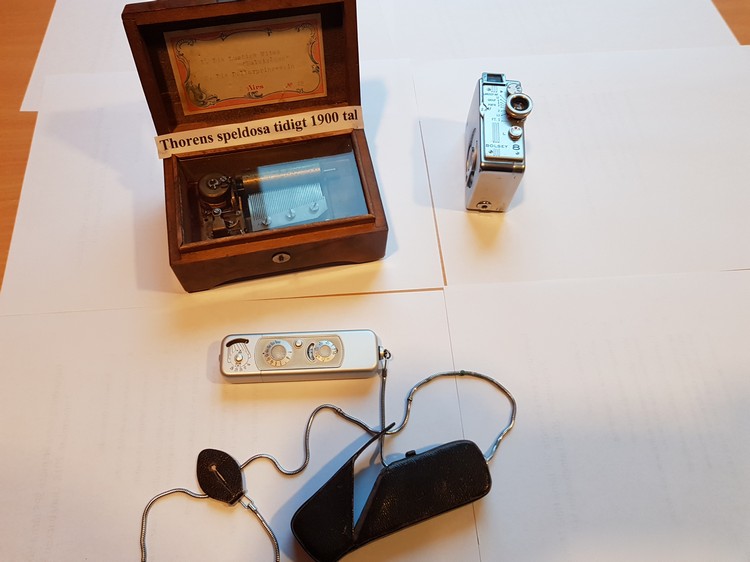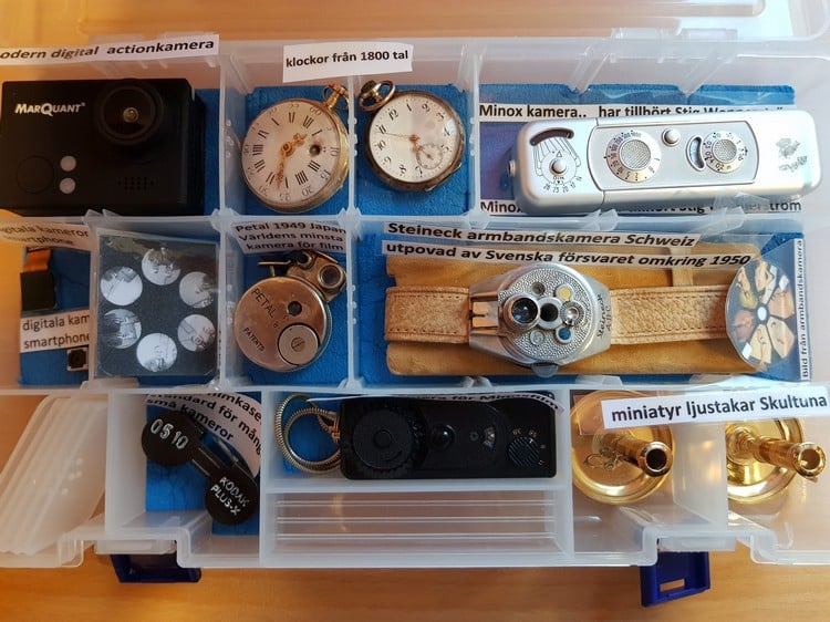 En fungerande speldosa, en filmkamera samt spionen Stig Wennerströms spionkamera, en Minox. Kameran hängde på kavajknappen och betjänades med en hand.