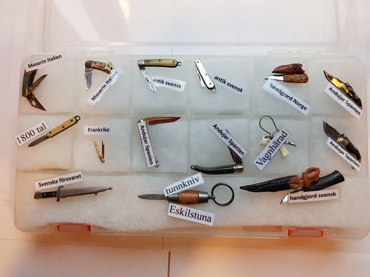En samling miniatyrknivar. Dessa är kopior av verkliga knivar.