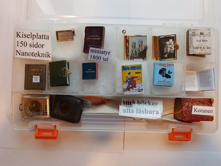 Här en unik samling av miniatyrböcker. Den lilla kiselplattan är på 150 sidor framställt i Nanoteknik. Bl. a fanns Nya Testamentet, en engelsk ordbok från 1800 talet och mycket annat "smått".