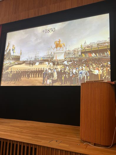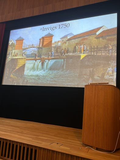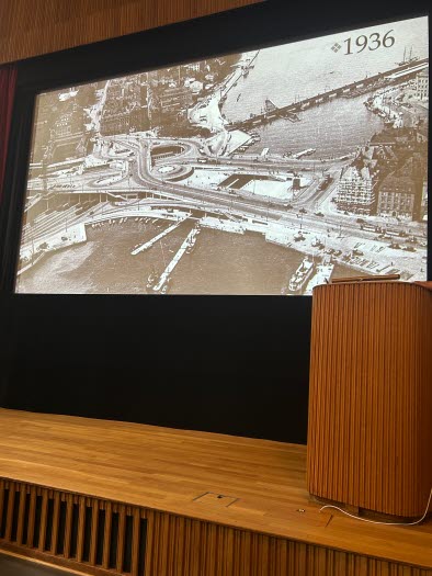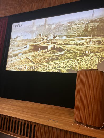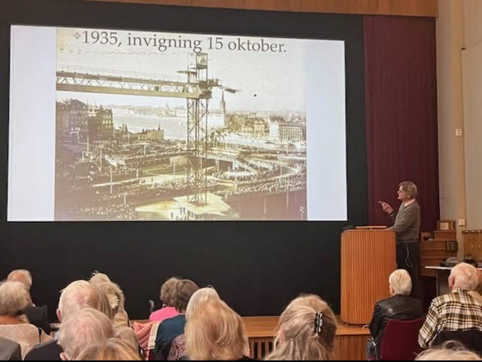 Hans Arnbom gav oss en trevlig genomgång av Slussens månghundraåriga historia. Det var många årtal och mycket fakta. Han visade också en stor mängd intressanta bilder och en kort film från början av 1900-talet. Det är mycket som nu börjar bli färdigt och ett studiebesök vid Slussen kan rekommenderas. Vi hoppas nu alla att den nya Slussen, Victoria-slussen, blir en väl fungerande trafikplats och en uppskattad mötesplats för alla stockholmare. Det var fullsatt i hörsalen. Vi hade alla lärt oss lite mer och tackade med en stor applåd.