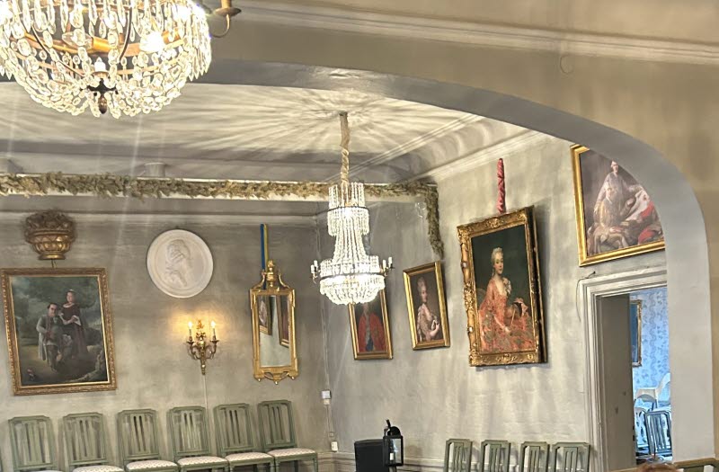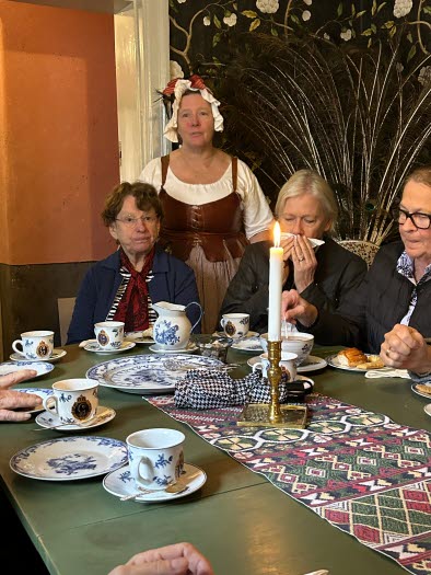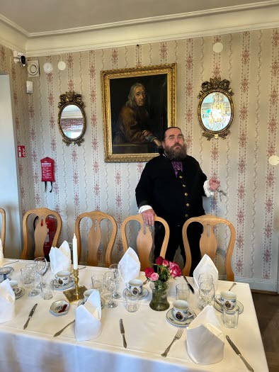 Det mesta av den ursprungliga inredningen försvann under dessa år. Efter hand har huset återställts och ny inredning har anskaffats, bland annat utnyttjades möjligheten att köpa in möbler i Ikeas gustavianska serie. Annat har man hittat på auktioner och loppisar. Allt ser mycket autentiskt ut och det är verkliga vackra salar som vi förs igenom. Vi kunde beundra en vacker dukning där besticken ligger lite utåtriktade. Det fanns det plats för eftersom man då bara hade en uppsättning bestick.