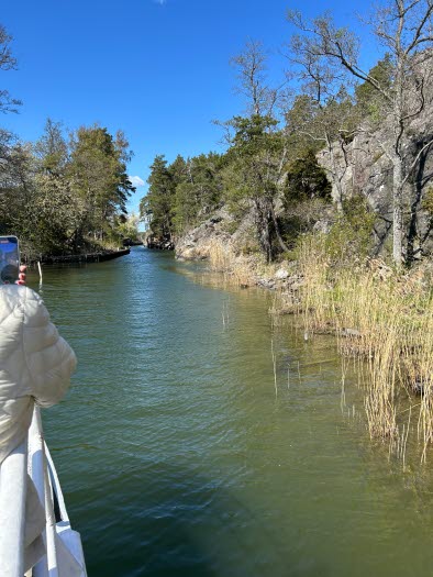Snart kunde vi vika av in i Dragets kanal. Det var spännande. Före motorernas tid fick man dra båtarna, därav namnet. Från början var det ett sund, men med tiden sjönk vattennivån och det blev alltmer svårt att komma igenom. Men stället har alltid varit viktigt som passage, så med jämna mellanrum har det muddrats, sprängts och breddats. Dock är kanalen fortfarande så smal att det blir knepigt med möte. Skepparn fick tuta för att varna eventuella båtar från andra hållet. Möjligen kunde en smal kanot ha fått plats. Djupet är inte heller så stort, så det vill till att det inte är lågvatten. En skön sak var det inte blåste här. På babords sida hade vi Järflotta, som i dag är ett naturreservat och inte längre bebott. Ett tag fanns det också en militär anläggning där. Vi kom lyckligen igenom kanalen och kom ut på en fjärd som kunde ha lett oss in i Nynäsviken. Men dit ville vi inte, utan vi vände efter ett tag och tuffade igenom kanalen igen. Inga möten det här gången heller. I dag är kanalen ett fornminne.