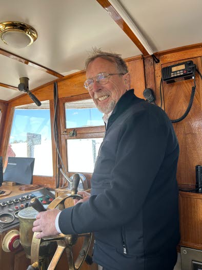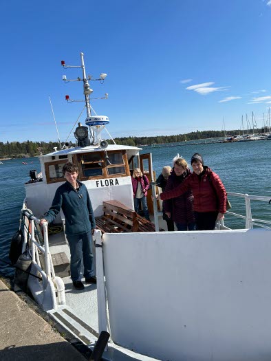 Efter det var det dags att gå ombord på M/S Flora. Matrosen Felix hjälpte mig galant ombord. Kapten Kåre Eksell, tillika redare, styrde inte bara båten utan guidade också.