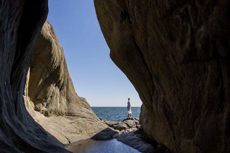 Kapten Kåre pekade också ut nästa sevärdhet lite längre söderut, Lövhagen, även det en halvö. Det är ett stort friluftsområde med café, vandrarhem, stugor att hyra, klippbad och stränder. Här finns också spännande grottor, som man måste ta sig till från sjösidan. En lång vacker väg, officiellt Strandvägen men i folkmun Ringvägen, slingrar sig utmed kusten. Området såldes till Nynäshamn på 1910-talet av generalmajor Henri de Champs på villkor att det skulle bli just ett friluftsområde. Och så är det alltså än i dag. Så framsynt han var generalmajoren!
