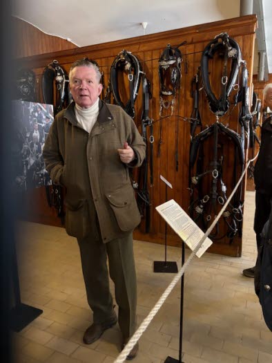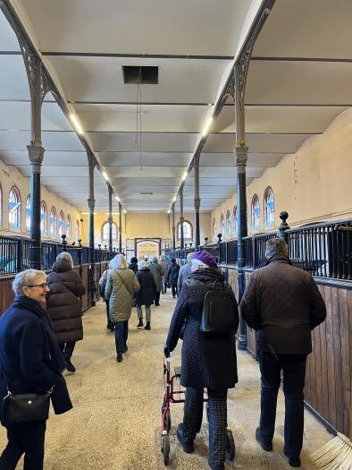 Vi stod först vid fel ingång till Hovstallet, vid Väpnargatan. Men vi dirigerades snart till ingången på gaveln mot Sibyllegatan. Där blev vi mottagna av vår guide Lars-Olof Nilsson. Han blev stallmästare där 2007, och har en gedigen militär bakgrund med överstes rang.