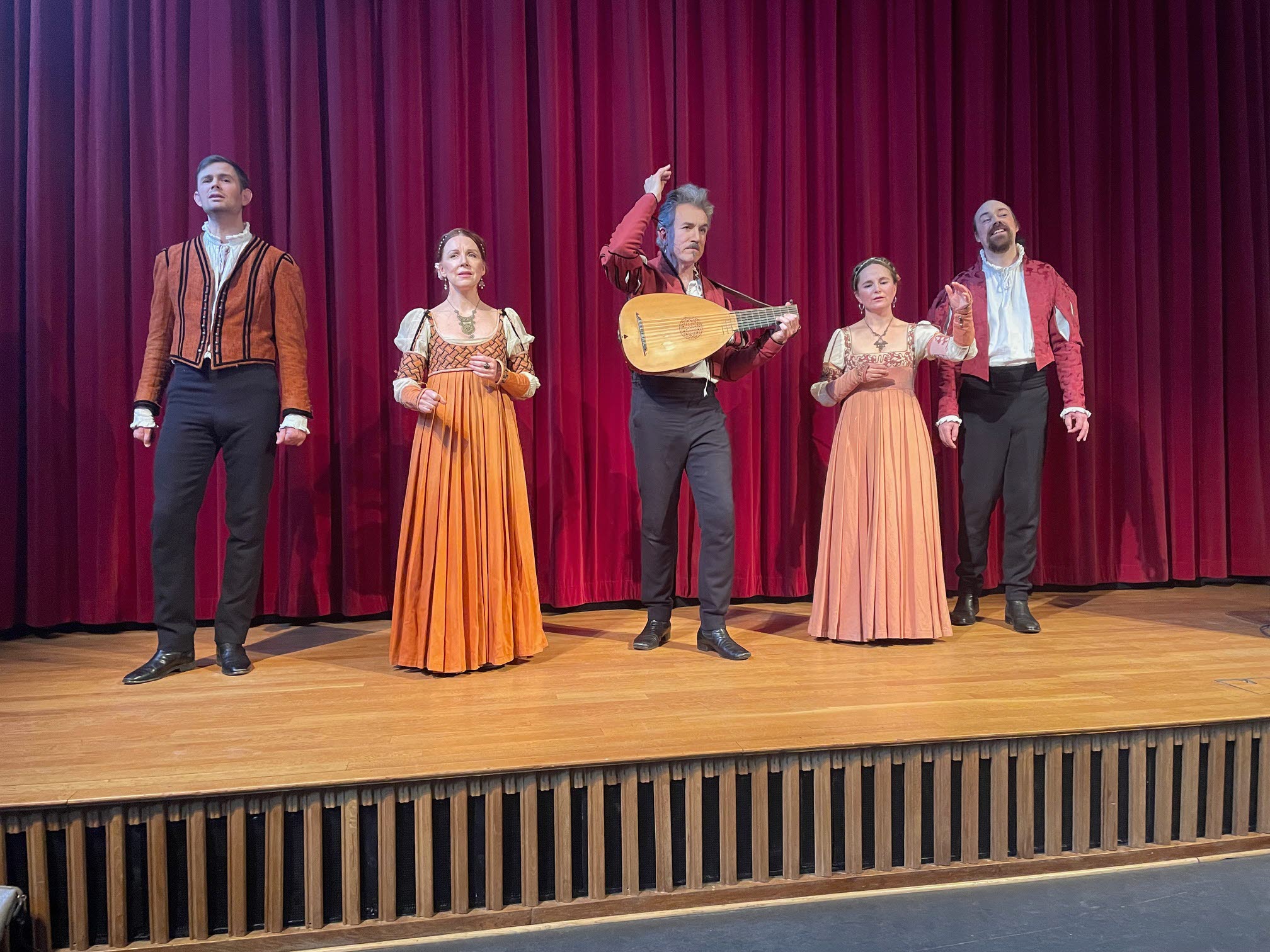 Efter årsmötesförhandlingarna blev det underhållning. Vi gästades av en kvartett ur Romeo & Juliakören plus en medlem som spelade på luta. Det går inte att skriva ett vanligt referat om denna totalupplevelse. Det var sång, musik, dans och agerande och vackra dräkter. Temat var anpassat efter årstiden, nämligen maskerad. Musiken var av den italienska renässanskompositören Bartolomeo Tromboncino. Den lilla italienska som jag kan hjälpte inte mycket, för man sjöng på ett ålderdomligt och dialektalt språk. Men aktörerna förklarade vad som var på gång, och mimik och agerande bidrog också till att man förstod.