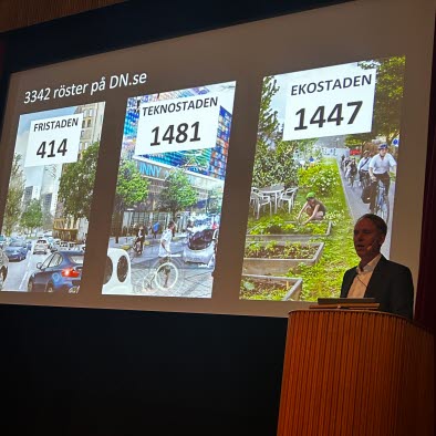 Alexander bad oss rösta vilken framtid vi önskade för Stockholms del. Var det Fristaden, som i stort sett bara innebär oreglerad tillväxt med tätare innerstäder ökande biltrafik och eftersatt kollektivtrafik. Eller var det Teknostaden med självstyrande bilar, drönare som sköter varuleveranser, eller var det Ekostaden, där man odlar grönsaker i parkerna, där folk cyklar eller åker i elbilar i skytteltrafik.