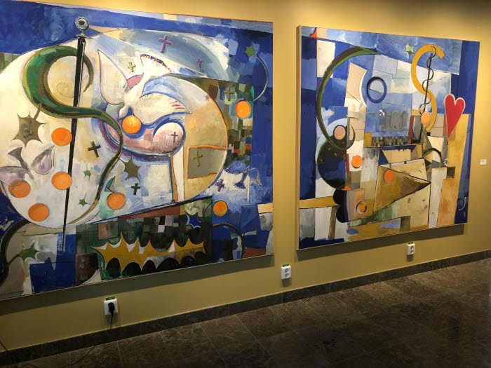 Vi gick ut i entréhallen igen. Där såg vi på ”Bullen och backen” av Alfred Boman. Amelie sa att sjukhusets policy vid konstinköp var att köpa förstahandskonst, eftersom man vill gynna konstnärerna och inte konsthandlarna. Konstnären i det här fallet är verksam i Stockholm, något som man också vill stödja. Han fick i uppdrag att skapa ett större konstverk för entrén. Han utförde det som en diptyk, alltså ett tvådelat verk. På så sätt skulle verket vara lättare att flytta på om man ”tröttnade på det” som han anspråkslöst har uttryckt det. Det tror jag inte att vare sig besökare eller personal gör. Det är ett färgstarkt symboliskt verk, som man kan titta länge på. Där finns mängder med bilder som associerar till vård, liv och död.