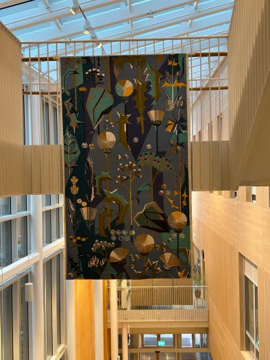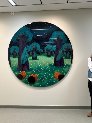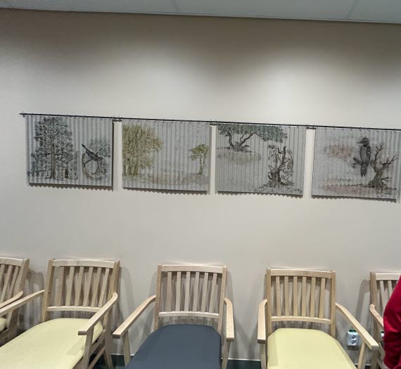 På Gastromottagningen har konstnärsduon Laura Fahlsten och Britta Kjellgren Jäger åstadkommit ”Bortom skogen”, ett verk i fyra delar. Motivet är fåglar och träd, och det är målat på duk som veckats, så det ser ut som korrugerad plåt.