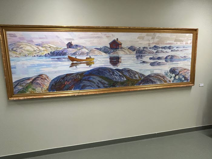 De finns på Kirurgmottagningen, som har temat hav och skärgård. Där finns också det som sjukhuset ser som sitt paradverk, ”Morgon” av Roland Svensson. Det är ett stort verk, 3 meter brett. Det är konstnären själv som skänkt det till sjukhuset som tack för god vård. Det har placerats så att man kan se det utifrån genom ett fönster. Så omtänksamt!