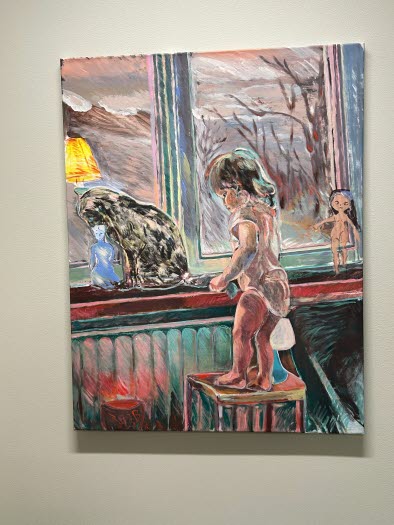 Eftersom vi var på sjukhuset efter stängningstid fick vi också gå in på mottagningarna. På Hjärtmottagningen såg vi ”Svansen på katten” av Duda Bebek. Som betraktare får man blandade känslor. Undrar vad som händer om flickan rycker till ordentligt? Kommer katten då att ha ned den lilla statyetten på golvet? Så blir man orolig över flickan. Det verkar inte så säkert att stå på den där pallen. Fönstret är stängt, men hon kan ju ramla ned på golvet och slå sig.