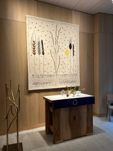 Utanför det lilla kapellet på entréplanet hänger två keramikänglar av Otte Sköld, ett av de många konstverk som skänkts av en tacksam patient. Altaret har formgetts av Emma Olbers av trä från de avverkade träden i parken. Det var roligt att höra att Urban Beckfjäll, anställd vid Ersta diakoni, har broderat de fina altardukarna. Han var vår guide vid vårt besök på ”gamla” Ersta, och då berättade han just att han ägnade sig åt kyrklig textil.