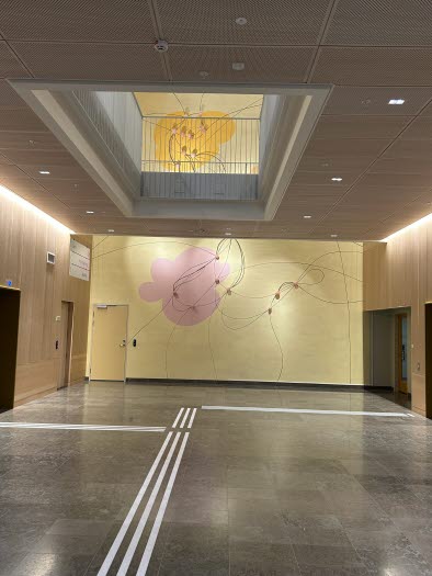 På väggen längst bak på entréplanet finns det stora platsbyggda verket ”Trådarna – en del av något större” av Carin Ellberg. Det sträcker sig upp flera våningar upp. Man ser trådar som slingar sig och hålls ihop av små glaskupor i milda rosa nyanser. Konstnären har tänkt på de rötter hon såg i den gamla parken innan det nya bygget tog vid och har också inspirerats av hur svampens rötter breder ut sig. Det är en symbol för hur vi alla hänger ihop.