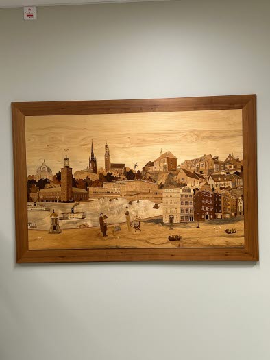 Ett annat verk på temat är ”Stockholmscollage” av Anita Jany von Battaszek. Det är en intarsia i trä, och där man ser stora delar av Stockholms kända byggnader, lite hopträngda för att de skall rymmas.