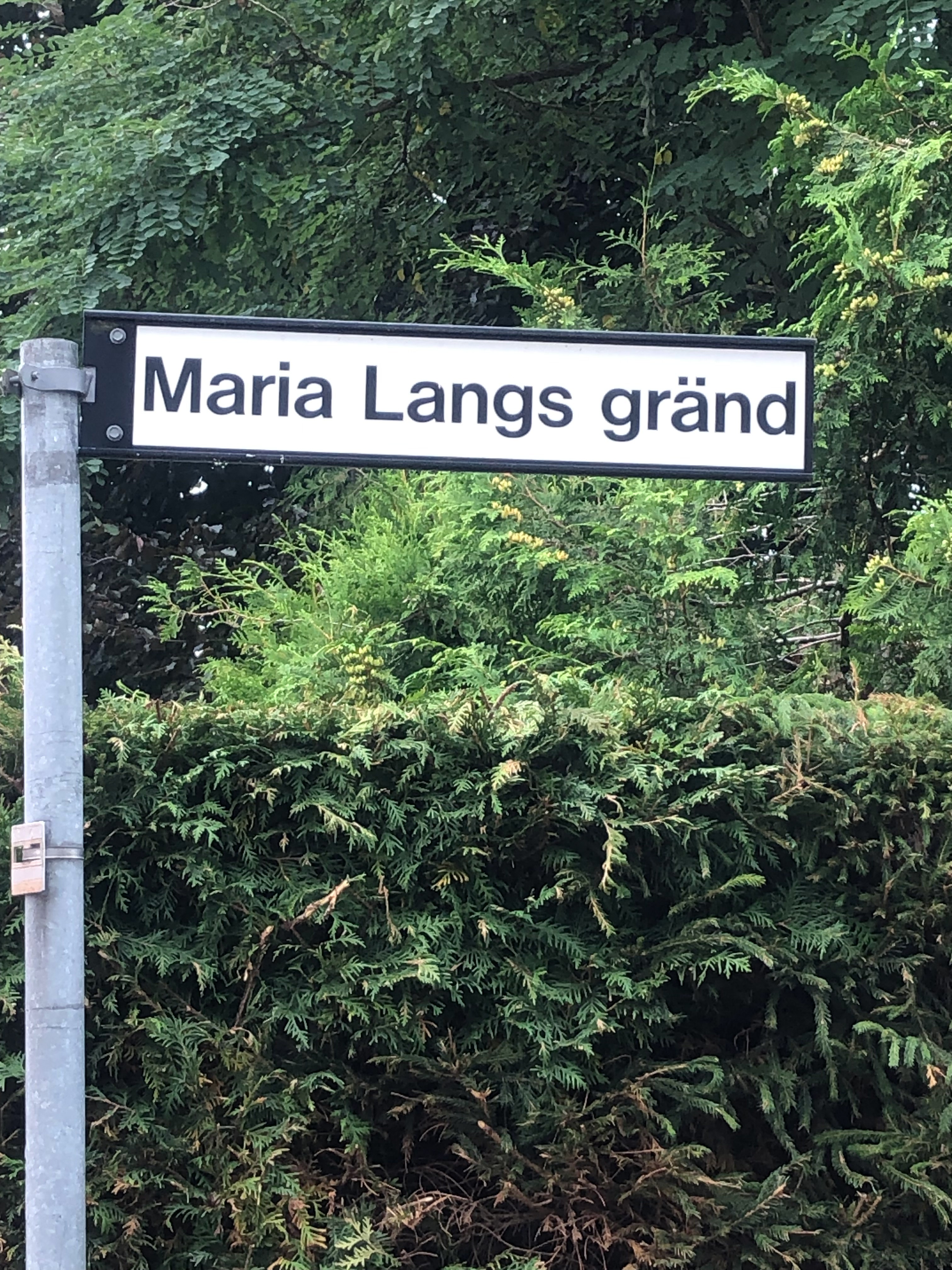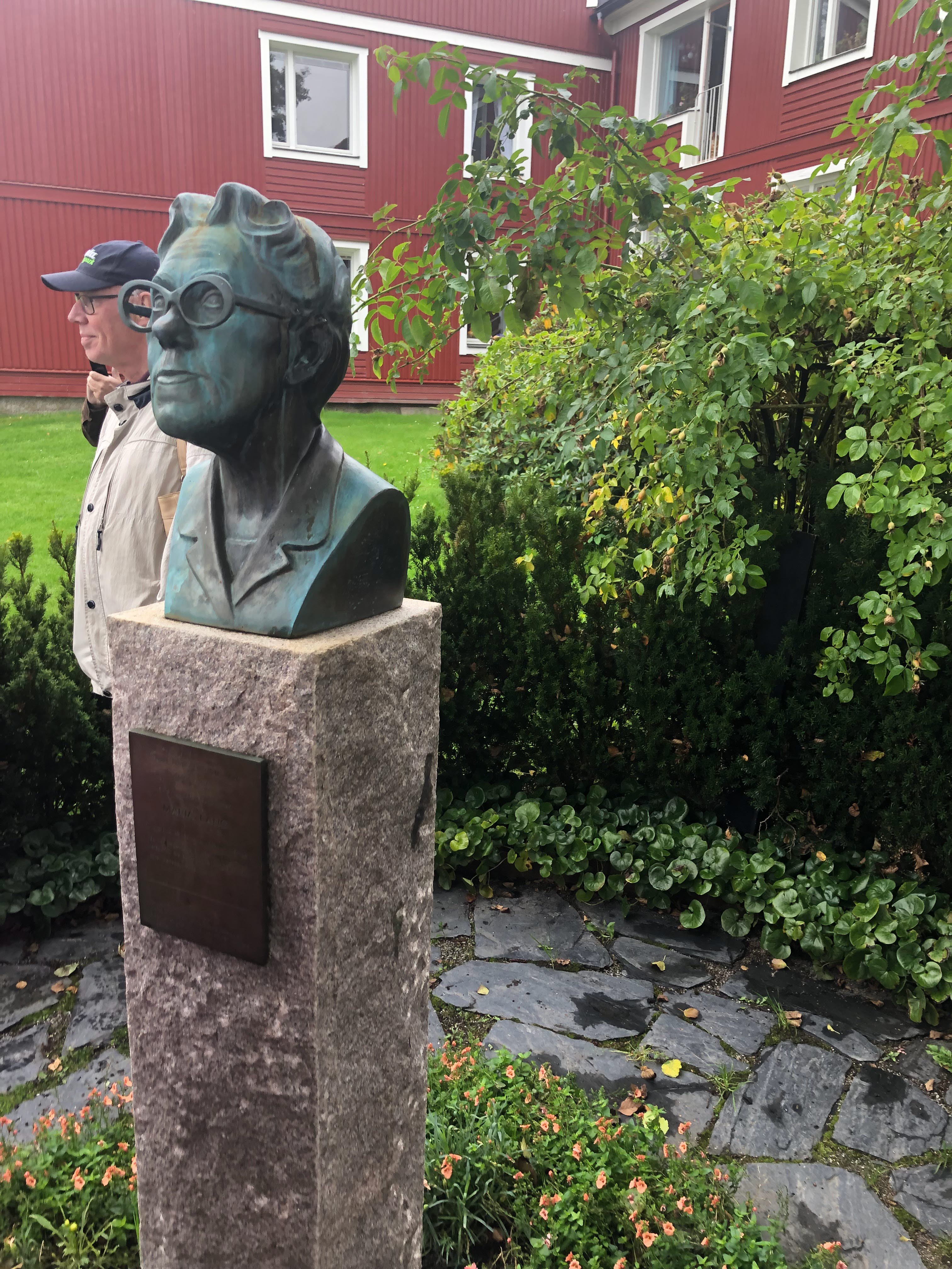 Det var roligt att följa med Ove på denna vandring i Maria Langs fotspår. Vi slutade vid hennes staty som finns i närheten av hennes bostad. Hon har också blivit hedrad med att få gatan intill uppkallad efter sig. Ove och Anette Rimònt, som guidat en annan grupp, spelade upp scener ut Lang-böckerna. De slutade med den bok som blev hennes sista bok, ”Se Skoga och sedan …”, som utkom 1990, ett år innan hon dog.