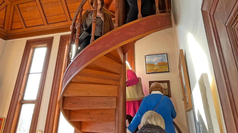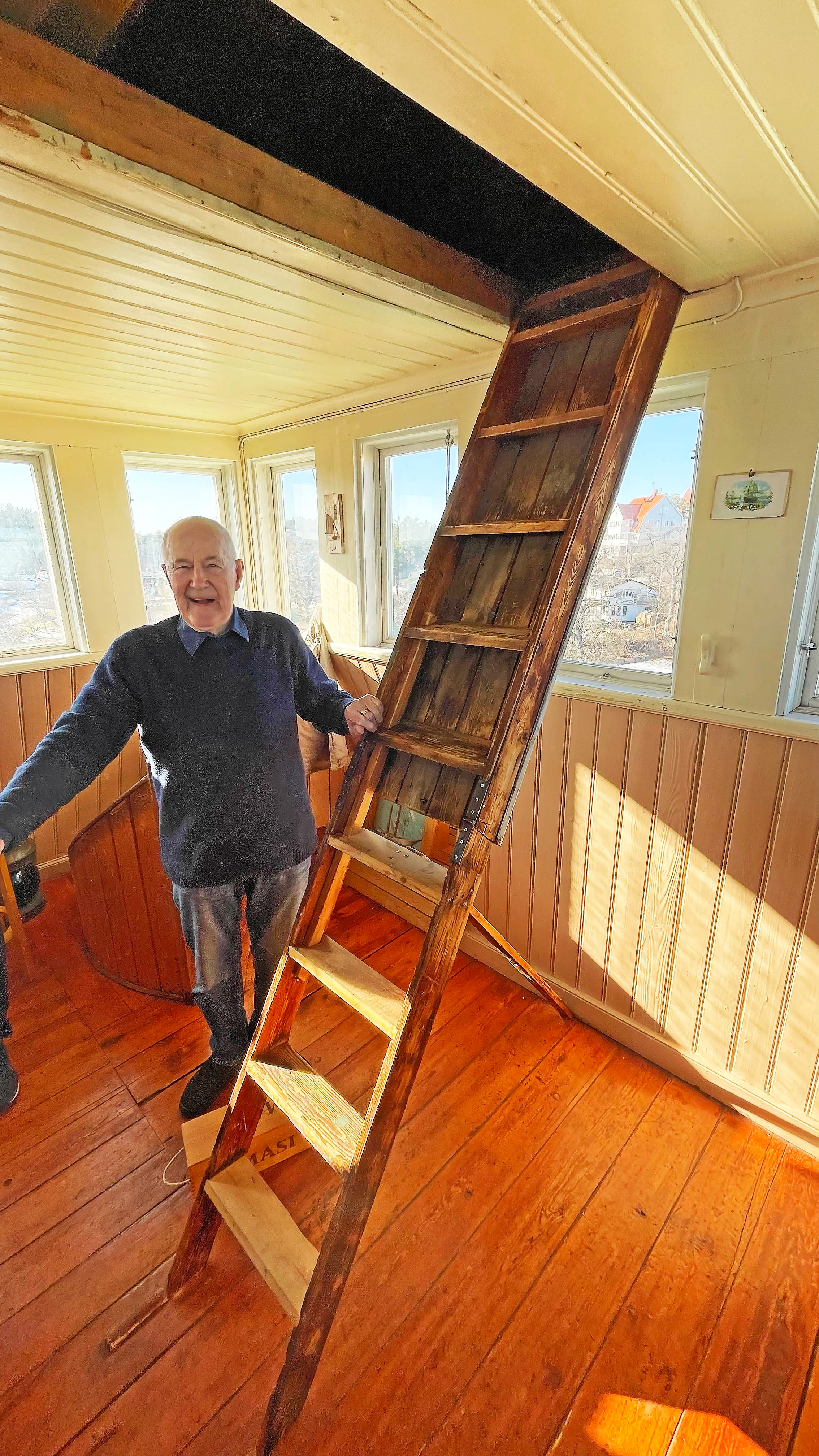 Så bar det upp till tornet. Pustande klättrade vi dit uppför två vindlande spiraltrappor med sammanlagt 40 trappsteg. Däruppe var utsikten över sjön ännu mer imponerande än från våningarna under. Det var en maritim inredning och för den stod Johan själv, som har en bakgrund i flottan. I ett hörn stod en sjömanskista som lär ha tillhört Georg Rydeberg, som var till sjöss i sin ungdom. Uppe i taket kunde man se en skylt där det stod ”Endast personal” på en lucka. Det var luckan till vinden. Därunder doldes en stege, som kunde vecklas ut bit för bit. Den stegen måste man klättra upp på och sedan gå upp ytterligare på en annan stege för att komma åt att hissa flaggan. Men en flagga får ju bevars inte sitta uppe om natten. Johan berättade att han därför numera nöjer sig med att ha en vimpel, för den kan sitta uppe jämt. Vi besökare tyckte att det var mycket klokt. Vi kunde ändå konstatera efter att ha följt honom upp och nerför alla trappor att han var långt spänstigare än de flesta av oss besökare. Något gym torde han inte behöva lägga sina pengar på.