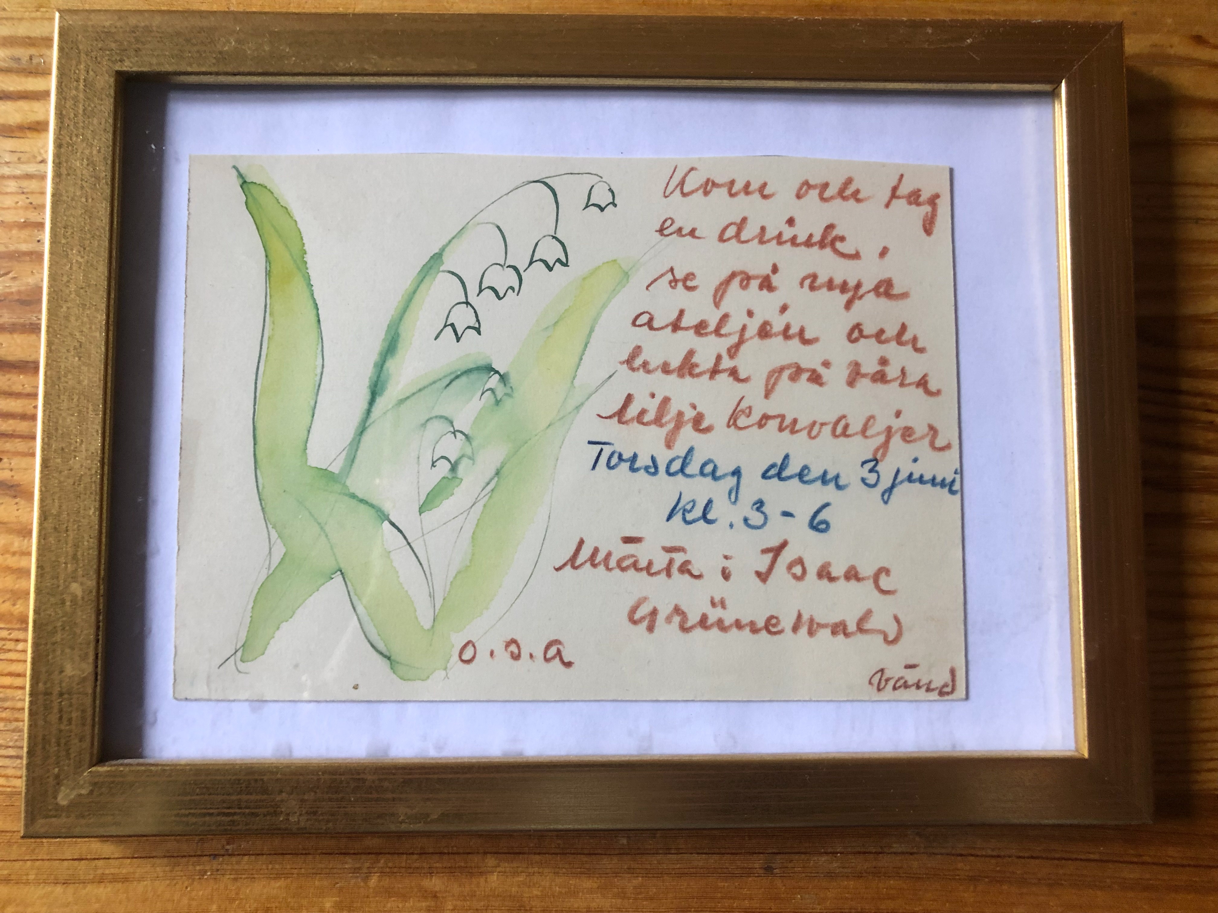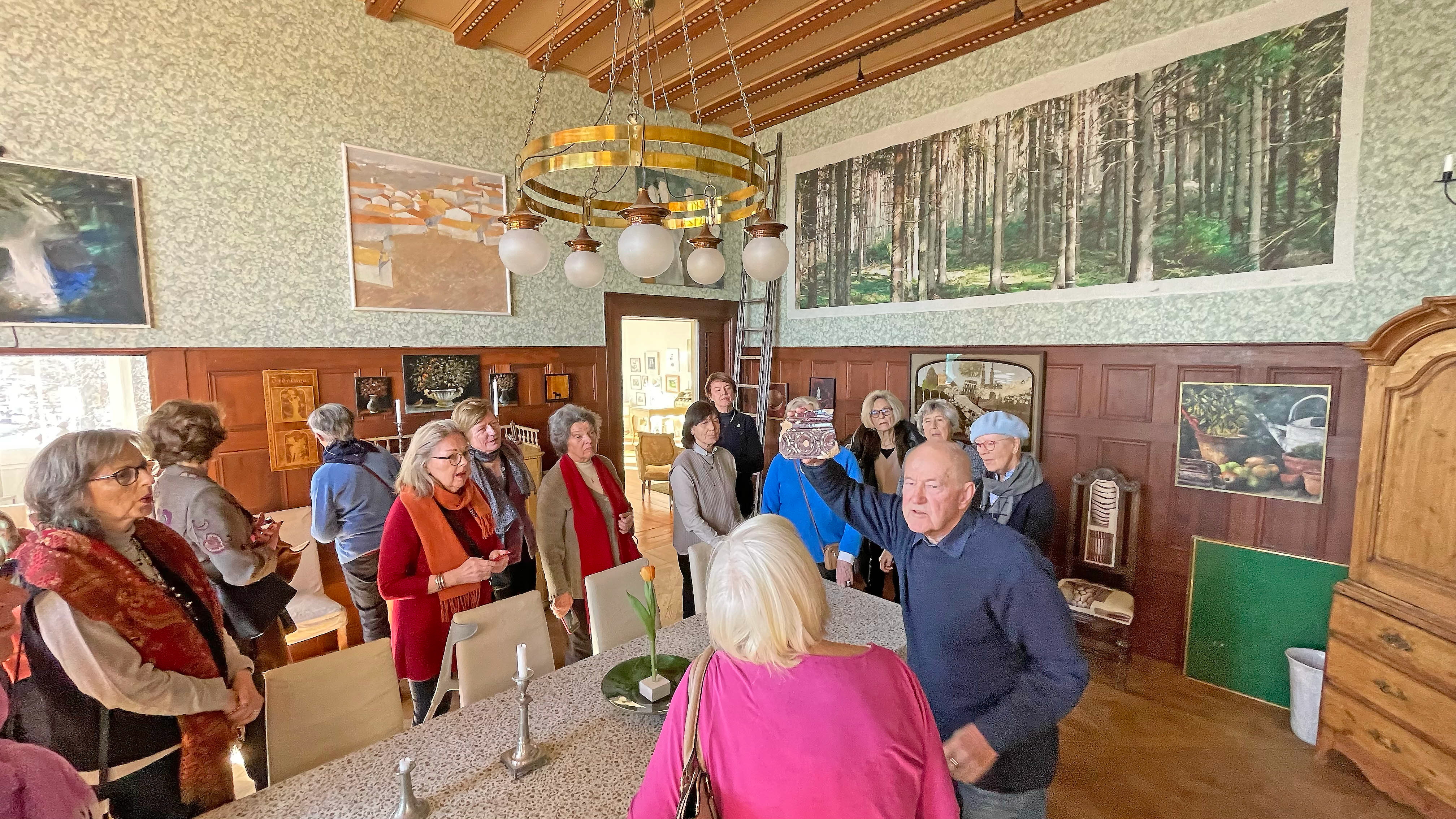 Vi fick vandra runt i hela huset. Det var den ena vackra salen efter den andra: vita rummet, blå rummet, gröna rummet, bibliotek. Alla proppfulla med fin konst och vackra föremål. Bl.a. kunde vi beundra en mycket fin snidad prydnadshylla och en vacker tidningshylla, som Johans farmor utfört i sin ungdom. Det visade sig att Johan har konstnärligt påbrå på ömse sidor. Farföräldrarna var utbildade konstnärer, båda föräldrarna likaså. Mormor var också en duktig målarinna, sa Johan. Inte så konstigt då att han valt att bosätta sig i en konstnärsbostad. Man kunde också hitta verk av bl.a. Carl Milles, Lars Lerin och Oskar Bergman. För att inte tala om broderikonstnären Anna Casparsson, som debuterade i 60-årsåldern. Johan visade också upp några kluriga små träskulptörer av Mårten Landgren.