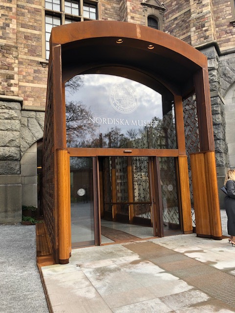 Vi såg också på den nya entrén på baksidan, som invigdes i somras. Marie visade hur skickligt arkitekten Lone-Pia Bach löst sin uppgift. Det är inte ett brutalt hål i fasaden utan en utbyggnad i form av ett långt valv, som öppnar sig på ett inbjudande sätt. Det är mjukt böljande pelare i ek och vackert mönstrade väggar i rostigt stål och glas. Här har man en entré med mänskligare mått än på framsidan. Det är praktiskt med ytterligare en entré, som dessutom ligger bekvämt till för besökare från Junibacken och Vasamuseet. För den konstnärliga utsmyckningen svarar Outi Pieski. Hon har inspirerats av de samiska samlingarna i museet. Väggarna anknyter till mönster i samiska dekorationsband och taket återger mönstret på en samisk sked. Hon kallar sitt konstverk "Two Directions", alltså 'två riktningar'. Det anspelar på diskussionen om museiföremål skall återföras till sina ursprungliga platser (alltså ut), eller om de skall bli kvar där de är för att flera skall få möjlighet att se dem (alltså in).