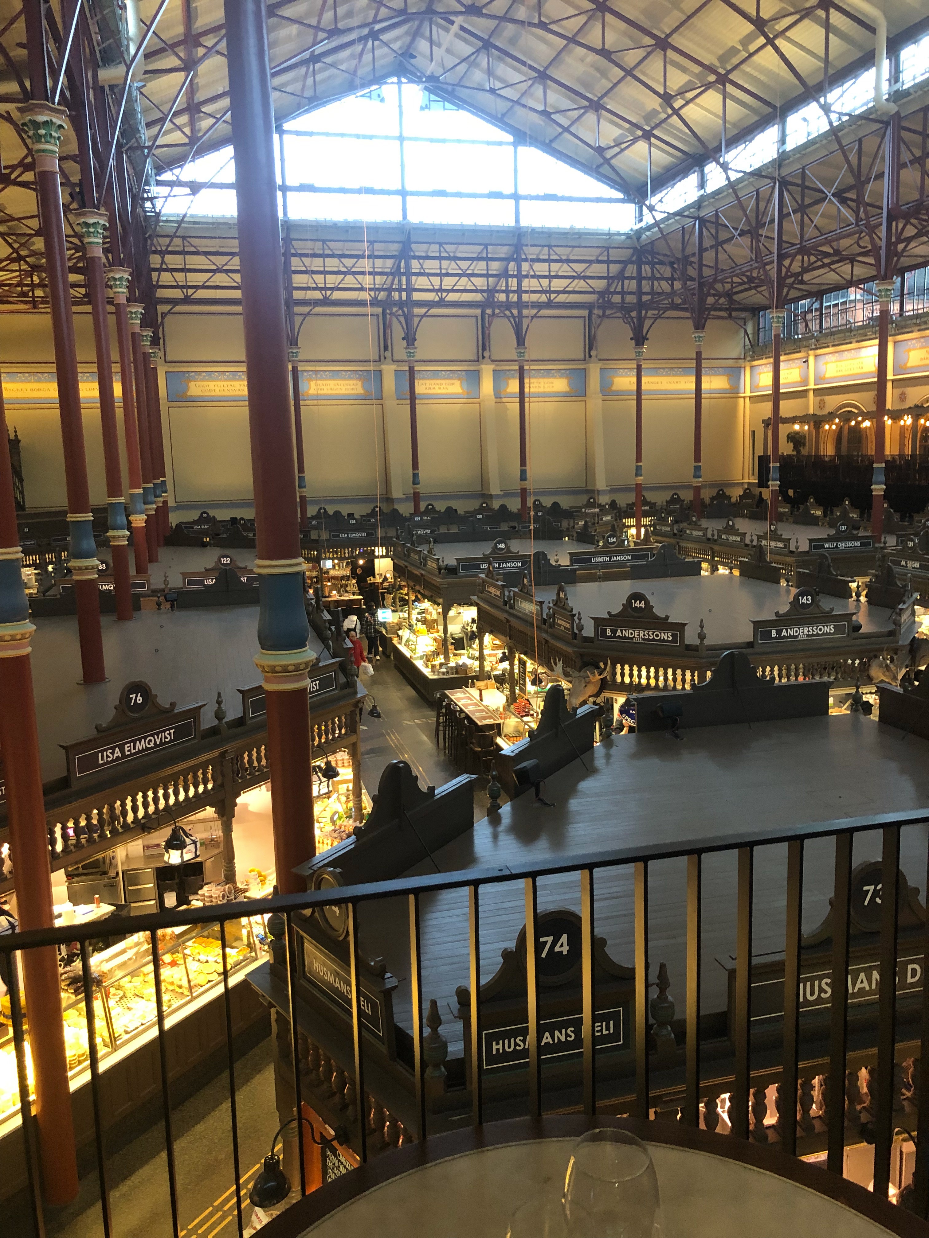 Renoveringen tog alltså längre tid och blev mycket dyrare än man planerat. (Låter bekant!) Fastigheten är blåklassad som kulturminnesmärke, så det går inte att göra hur som helst med den. Man har varit mycket mån om att den skulle återställas till sitt ursprungliga utseende så långt det går. Samtidigt måste den anpassas efter alla nya krav. Lina berättade att man nu fått en ny separat avdelning för avfallshantering. Tidigare fick avfall samsas med varulagret till glädje för råttorna! Nu är det bättre ordning, så råttorna har fått flytta utomhus. Under butiksplanet finns ett lika stort källarplan för varulager och tillagning, och där jobbar minst lika många som ovan jord. Utsmyckningen på väggarna med ordspråk och ommålningen av pelarna återspeglar hur det en gång såg ut. En nyhet är två nya balkonger där besökare kan sitta på olika serveringar och titta ned på kommersen i hallen. Restauranger har flyttats ut till fasadläge, vilket inneburit att dessa kan ha öppet på kvällarna, men samtidigt har en del butiksutrymmen försvunnit. Vissa takpartier har byggts på och nya fönster har satts in. Det gör att hallen är luftigare och ljusare än tidigare.