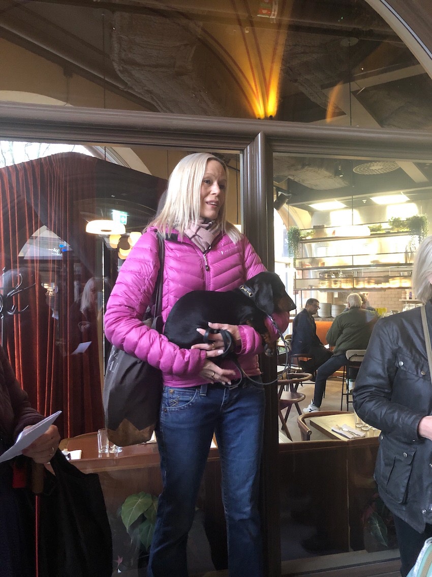 Så kom hon då vår guide, Lina Bielsten, i sällskap med en bedårande liten tax. Hundvakten hade fått förhinder, så lilla Quincy, som han heter, måste få följa med matte och han har så korta ben så det hade tagit sin tid att komma dit. Så klart vi smälte inför detta faktum. Ännu bättre kändes det när Lina lovade att vi skulle få varsin chokladtryffel efter visningen som kompensation.