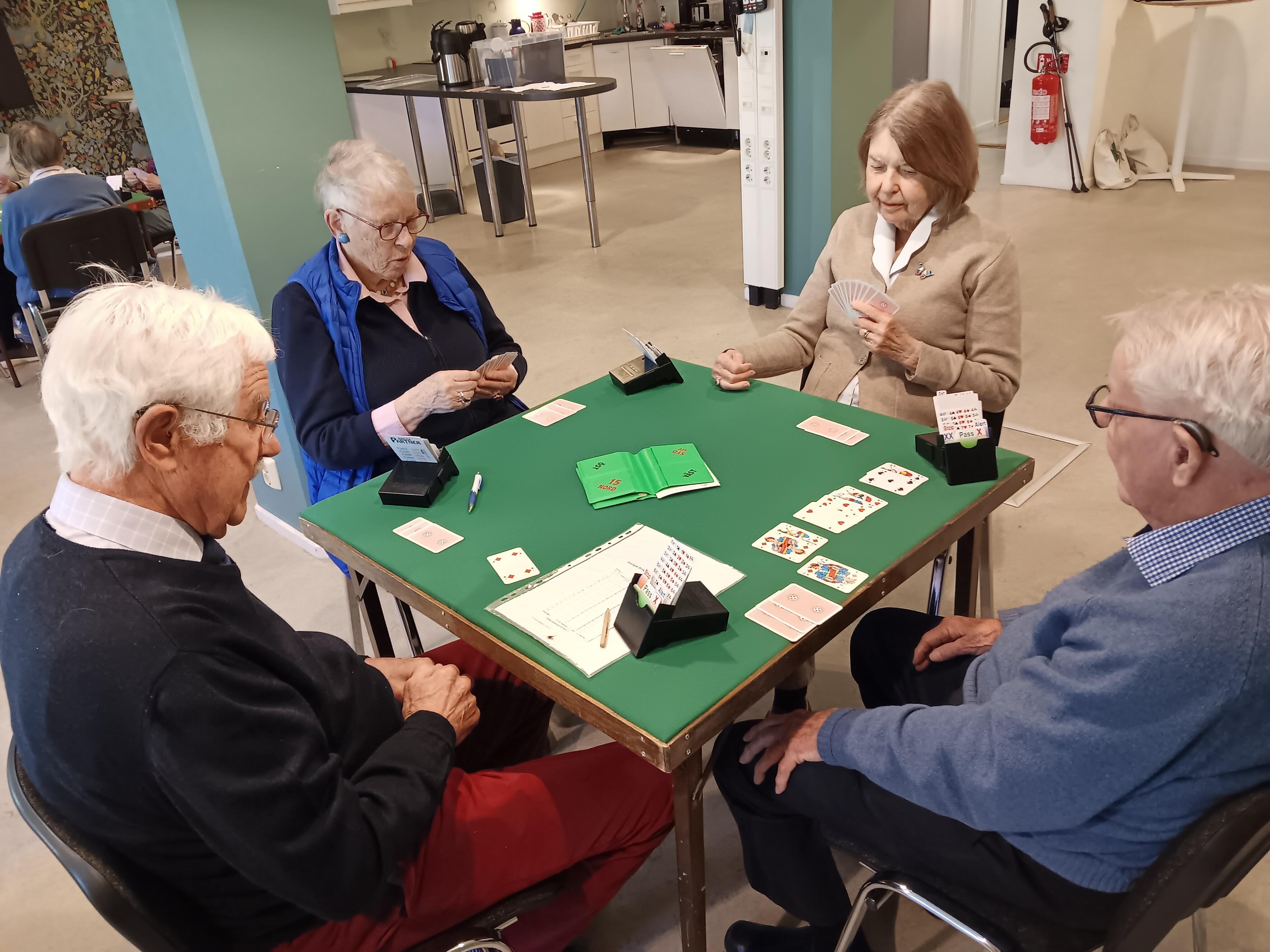 Dessförinnan har medlemmarna ställt ut bord och stolar, blandat korten och lagt i brickor. Vi spelar sedan till kl 16 eller 16:30 (tiden beror på hur många vi är) med en kafferast, då detockså blir en liten ”lektion” med anknytning till någon speciellt knepig bricka från föregående gång.