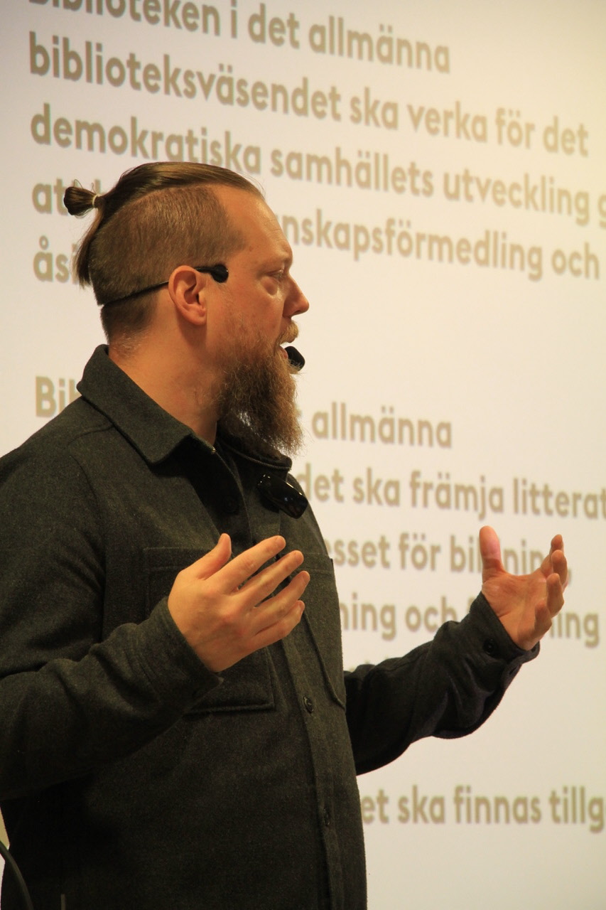 Näste talare var Daniel Forsman, stadsbibliotekarie. Han betonar att bibliotekslagen (ja, det finns en sådan) är tydligt med att biblioteket ska vara tillgängligt för alla, vara folkbibliotek. Undertecknad minns min hemorts folkbibliotek, där en av folkskollärarna härskade och inspirerade till läsning.