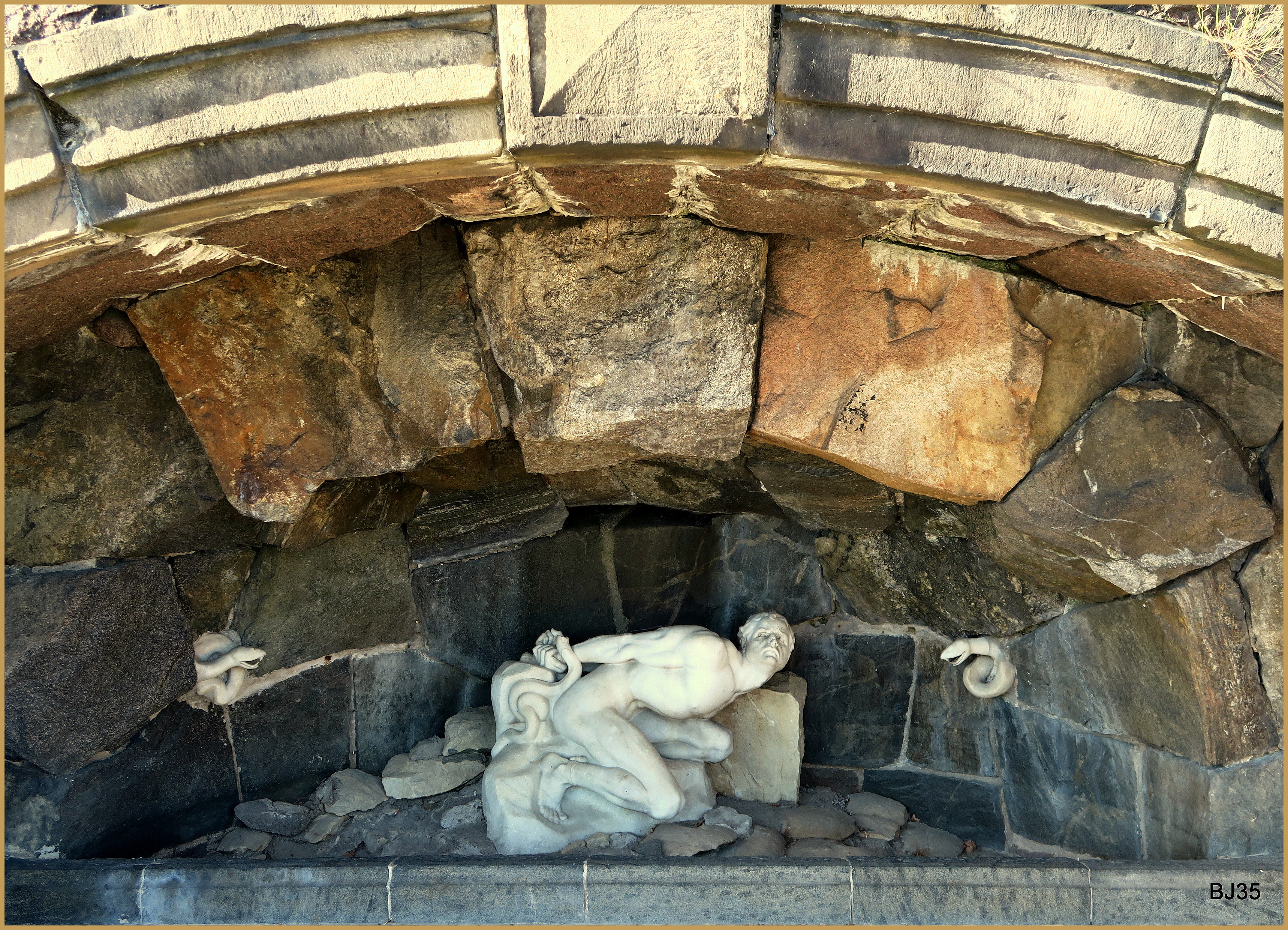 Även lejonmaskaronerna på ömse sidor av valvet kommer från bron som ritades av stadsarkitekten Erik Palmstedt och byggdes 1789. Det är efter honom platsen under brovalvet kallas Palmstedt grotta Redan 1867 revs bron men valvet bevarades som tur är. Ni hittar grottan och "Lokes straff" i muren bredvid Engelbrektsstatyn.