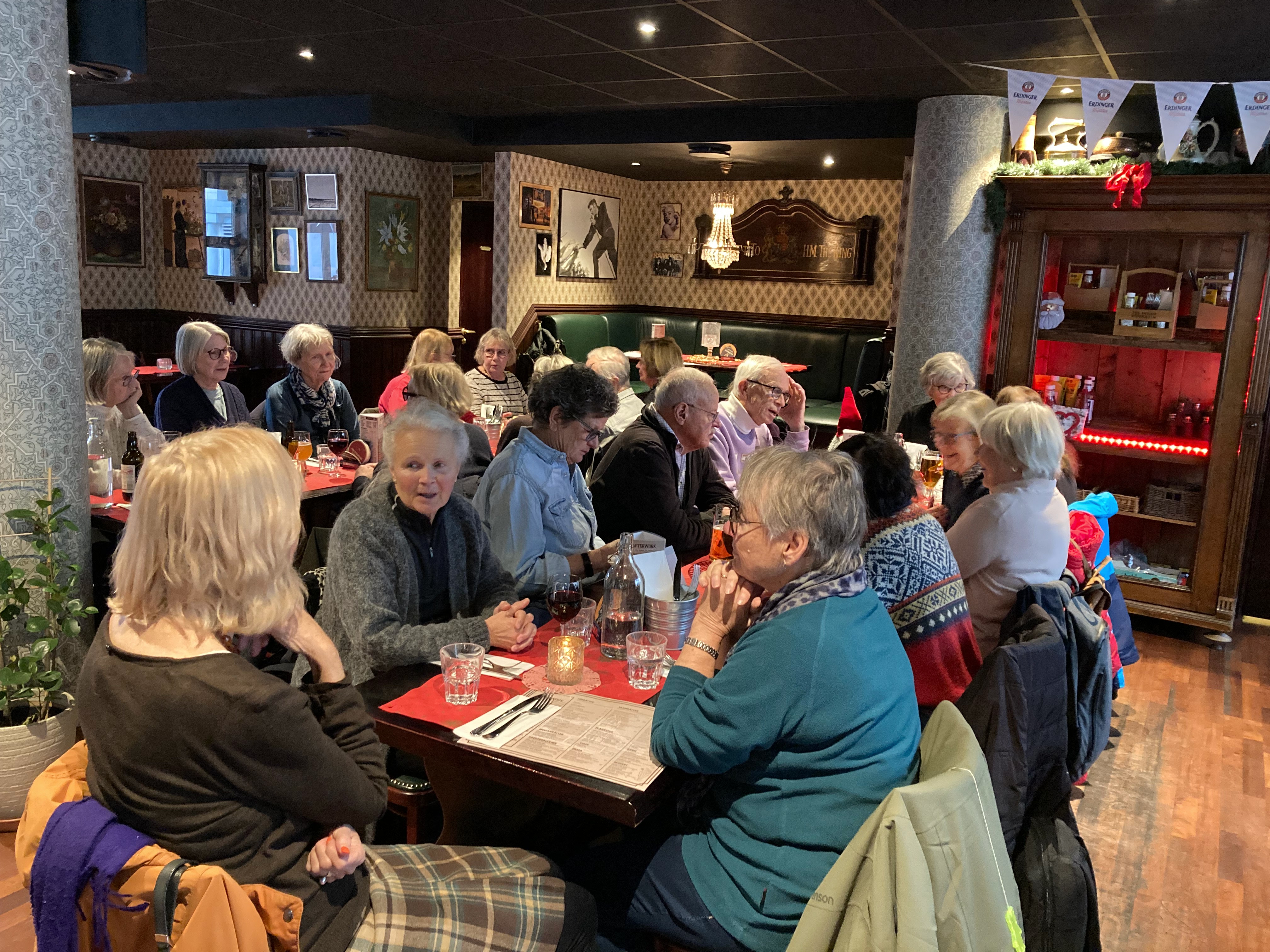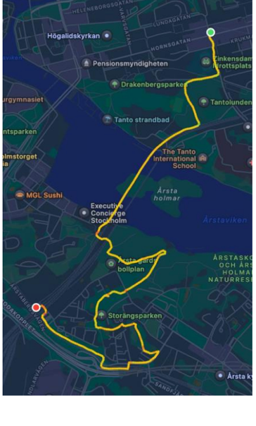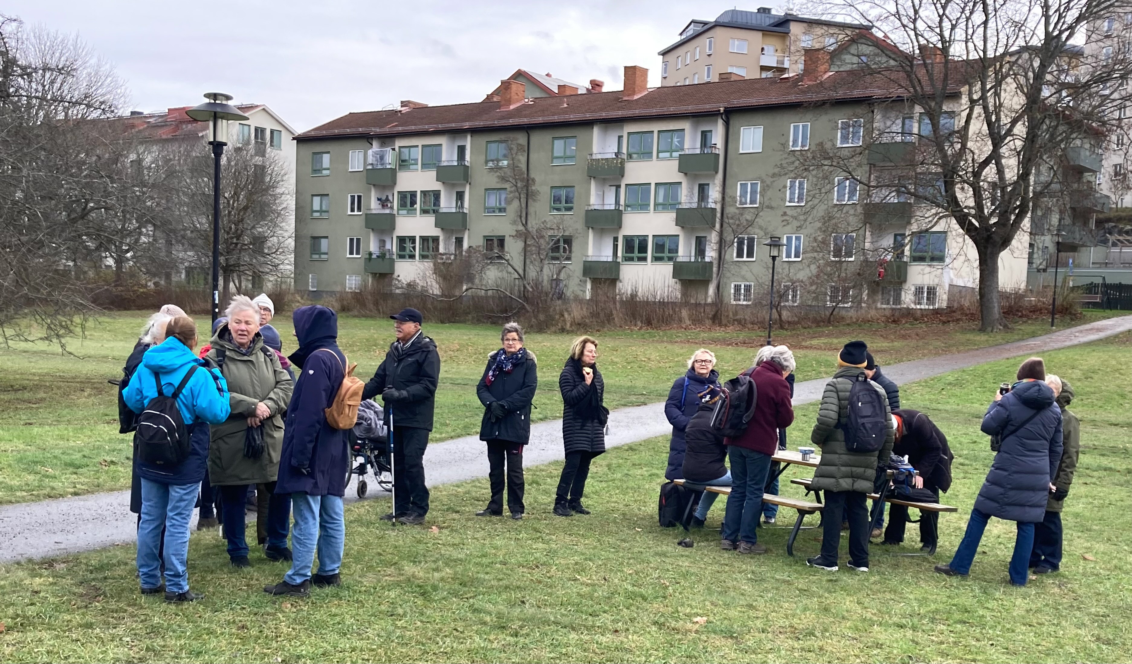 21 vandrare mötte upp till dagens vandring som också var höstens och årets sista. Den gick över Årstabron och genom flera parkområden i Årsta till pendeltågsstationen Årstaberg, för vidare färd med tåg till Södermalm och målet för dagen: avslutningslunch på "The Bridge". Efter lunchen genomfördes ett quiz, skapat av Eva W D och Carina A, med elva frågor om höstens vandringar. Bästa laget hade nio rätt och laget fick pris i form av varsin glögg på burk. Vandringssträckan var knappt 5,5 km och leddes av Carina A.