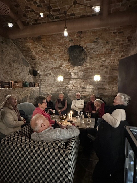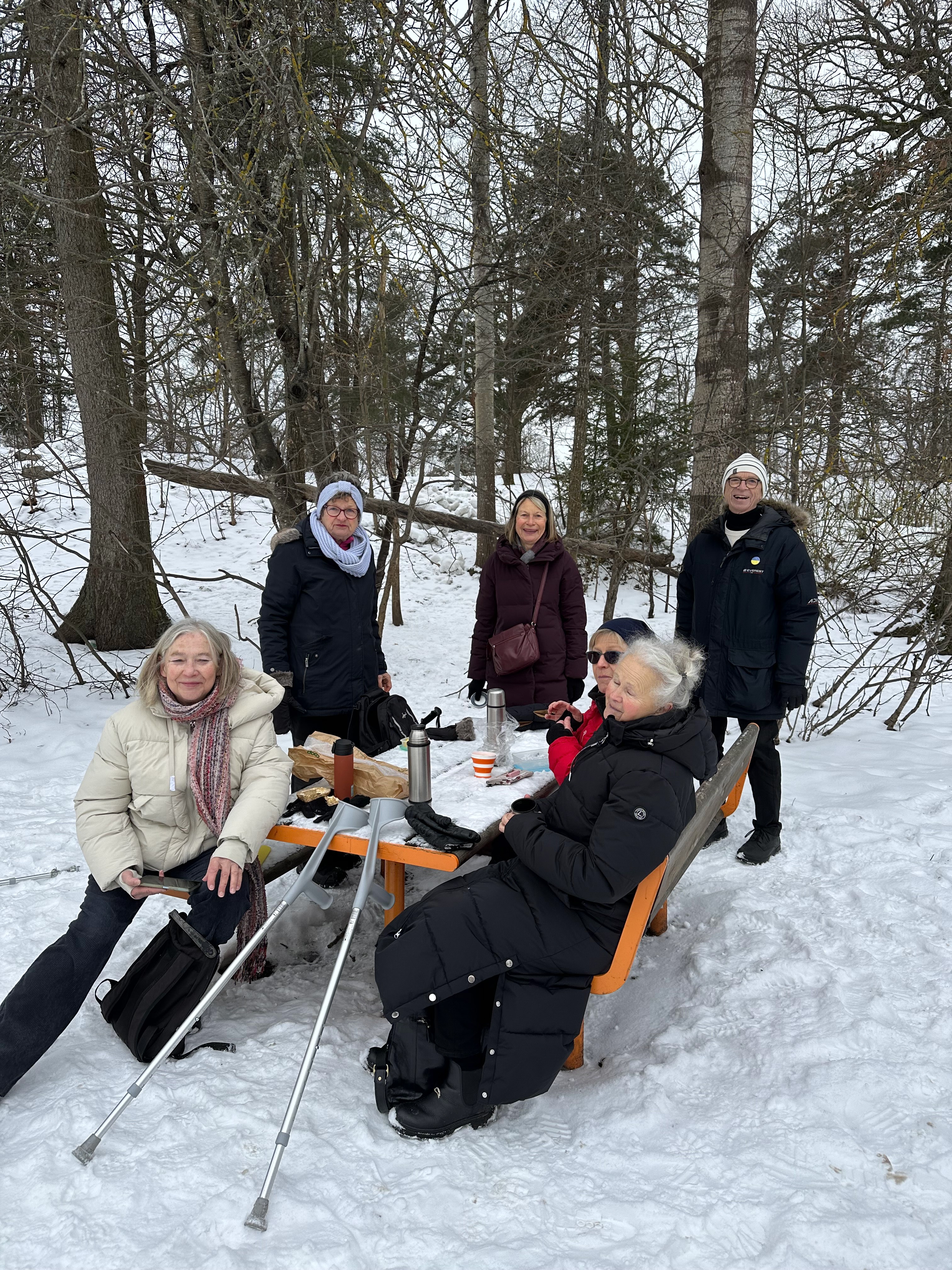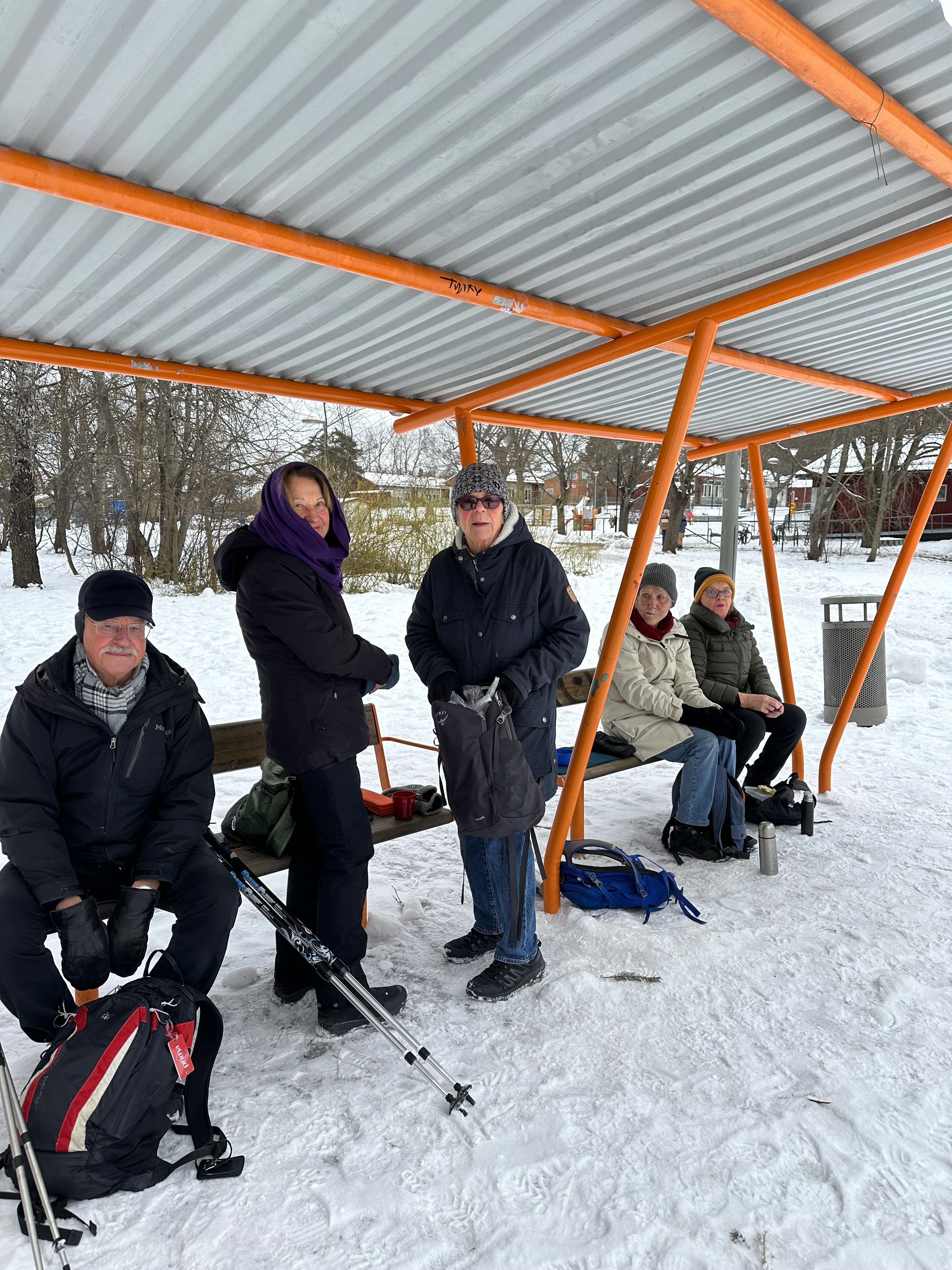 Halkrisken bedömdes som stor denna dag så topografin fick beaktas i vår planering. Vi var 12 medlemmar som började promenaden vid Älvsjö station och gick genom Örby, en av Stockholms äldsta villastäder, med villor ända från sent 1800-tal. Tomterna såldes med äganderätt och varje ägare fick själv bestämma stil, form och färgsättning av husen, vilket har resulterat i en intressant blandning. Vi slirade oss fram en lång raksträcka och efter en inledande piruett tog vi oss över Örbyleden till Stureby och stannade för kafferast i en lekpark. Vi fortsatte en isfri gångbana söderut och kom på smågator fram till Majroskogen (ej felstavat), ett naturområde som sträcker sig fram till stationerna på T-banans äldsta gröna linje. I Tallkrogen tog vi tåget till Slussen och vilade ut i hotell Frantz kolkällare med varsin återställare.