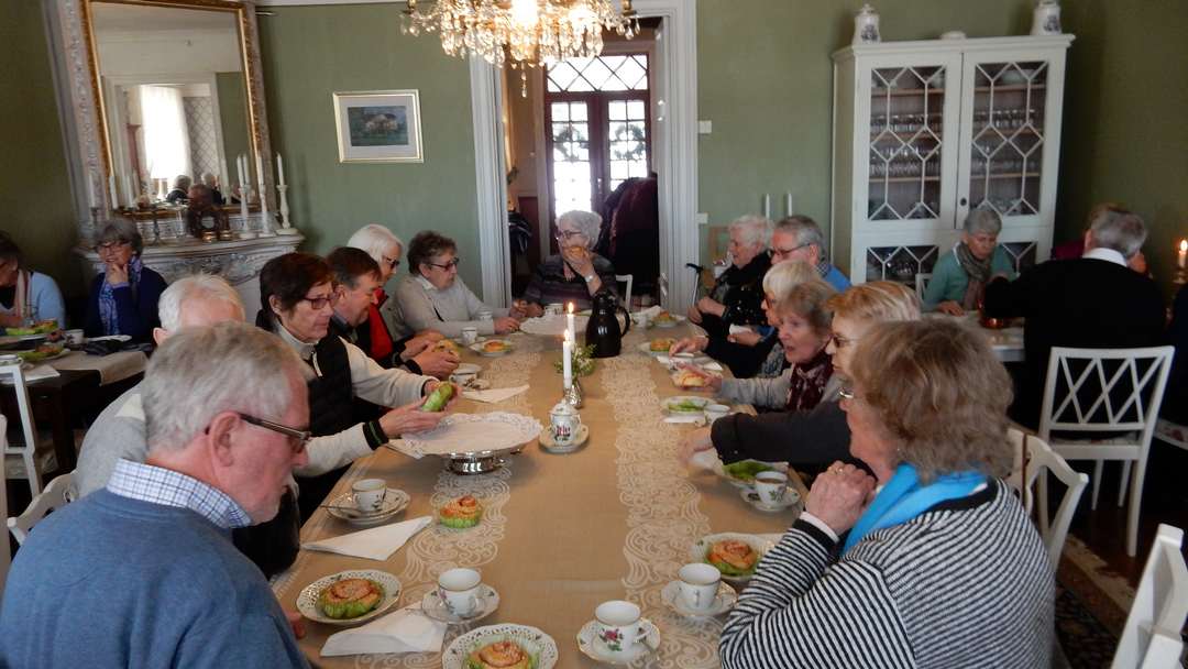 Där fick vi kaffe med dopp i en gammal byggnad med snickarglädje och vackra kakelugnar.