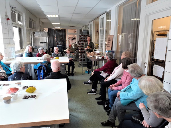 Vi var 21 personer som besökte Chokladfabriken i Stockholm den 22 mars.När vi kom dit blev vi serverade soppa med bröd därefter kaffe och tårtor.Sedan blev det visning av fabriken och Elinor berättade hur det går till att tillverka choklad från kakaofrukt till färdig choklad,vi fick också provsmaka olika chokladsorter. Det fanns också försäljning av choklad.Det var ett trevligt besök där.