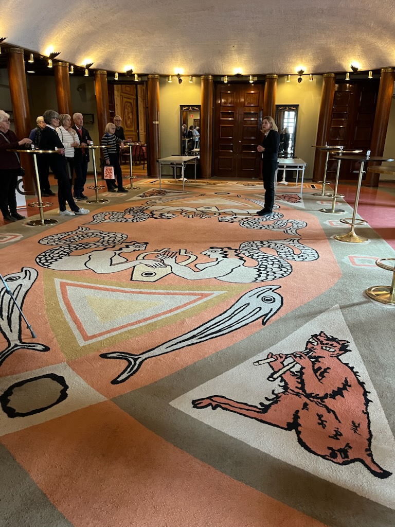 Ingången är mörk eftersom man befinner sig i dödsriket Hades. Ju längre in och högre upp man går i huset sprider sig ljuset genom allt öppnare ytor och lampor av olika slag. Högst upp finns Grunerwaldsalen och den oerhört stora och vackra stora salen dvs hjärtat i huset!. Där kan upp till 1700 personer sitta och lyssna tex till orgelmusik från 1600 pipor.Vi var 22 glada pensionärer som fick en visning av en mycket kunnig guide, Caroline som själv var musiker och kunde all historia på sina fem fingrar.