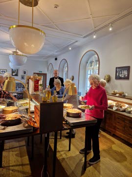 Vi kom fram i god tid till ett grått och litet morgontrött Sigtuna. Våra resenärer släntrade genom Storgatan fram till vattnet, den gulliga turistbyrån var öppen, några fikaställen likaså, men de flesta butiker öppnade kl 11.00. Målet för vår bussresa var den kända Sigtunastiftelsen och även Maria-kyrkan. Efter ankomst till stiftelsen väntade en god lunch och därefter blev det guidning inom anläggningen. Initiativet till stiftelsen kom från Manfred Björkquist och den invigdes 1917 med en utbyggnad på 30-talet. Det var intressant att få vandra runt i stiftelsens lokaler, pampig som en borg men med flera labyrintlikande trappor och gångar. (Inget för rörelsehindrade då, numera har man installerat hiss för att lättare nå fler utrymmen.)