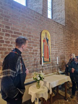 Nästa anhalt var Mariakyrkan. Där mötte oss en präst som berättade intressant om 1200-talskyrkan som grundades av dominikanermunkar. Den var först var utpekad som vår första domkyrka, men så riktades allt intresse mot hedningarna i Östra Aros, som därmed övertog dominansen med en domkyrka. I Maria-kyrkan finns flera vackra tyska altarskåp och utsmyckningar. Kyrkan är öppen varje dag för morgonmässa kl. 08.30. Intressant var också berättelsen om prinsessan Ingegerd, född i Sigtuna och drottning i Kiev-riket. Numera är hon helgonförklarad som Sankta Anna och symbol för Ukraina. En pilgrimsled kallad Sankta Anna-leden har nyligen etablerats med sträckningen Sala-Sigtuna-Norrtälje.