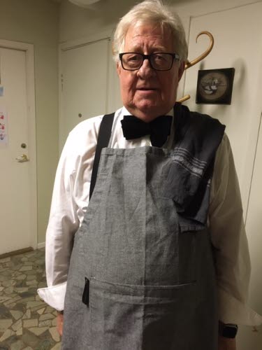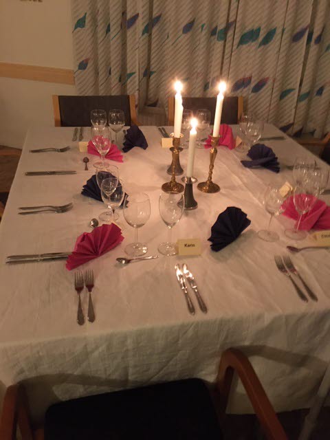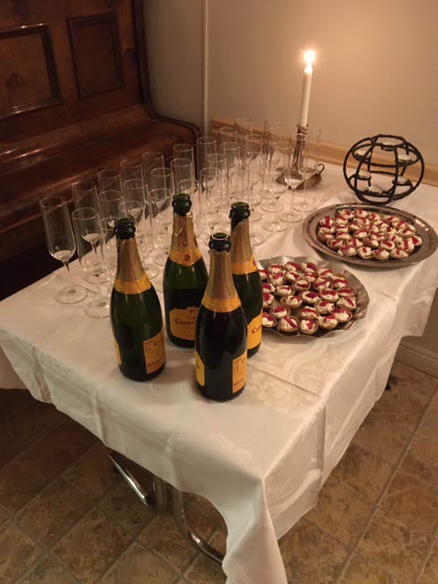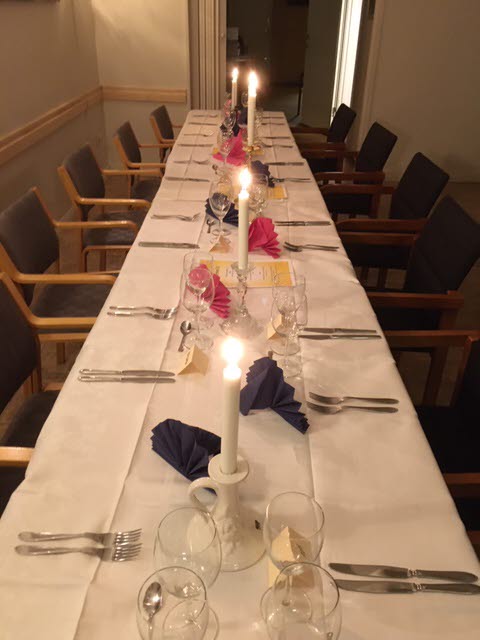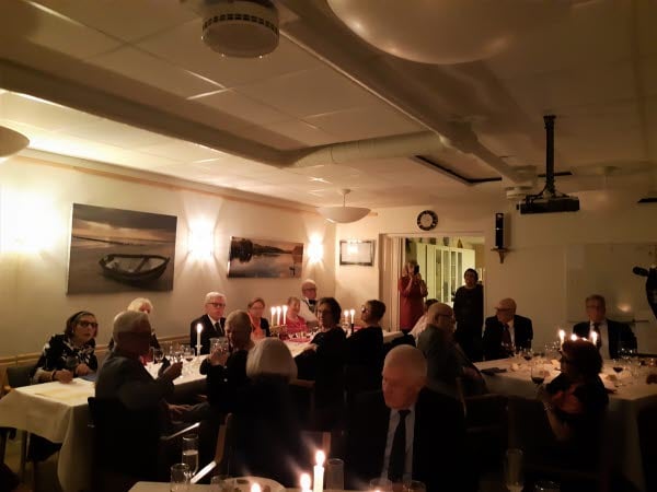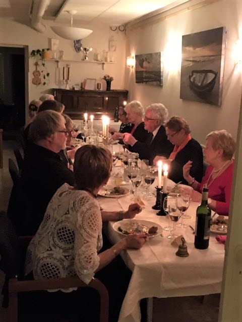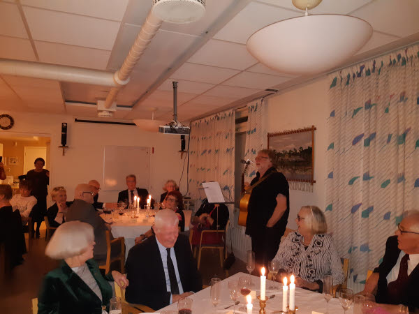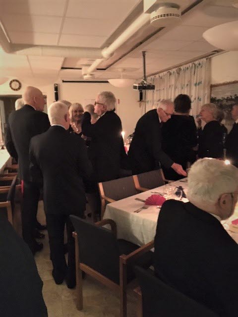 30 glada Handenseniorer festade med en trerätters meny bestående av parmalindad sparris med flagad parmesan & citronkräm,västerbottenfylld kycklingfilé med basilikasås & primörer, marinerade färska bär med limoncello & citrusmascarpone, vitt och rött vin, och avslutningsvis kaffe med avec.