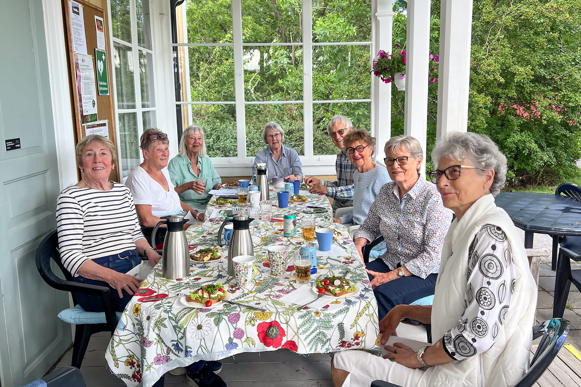 Höstens program planeras på Hustegaholm. På bilden från vänster: Marie, Solveig, Barbro, Gun, Michael, Eva G, Lena och Hannelore.
