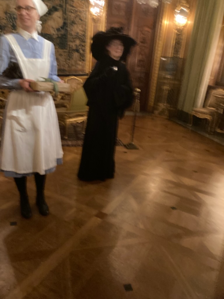 ... tjuvstartade vi julen med att gå på julkalas i det Hallwylska palatset. Grevinnan själv och husan Anna tog emot oss. De guidade oss genom pampiga rum och vi gick trappa upp och ned. De visade oss hur man firade jul för 100 år sedan. Ingenting har ändrats i palatset som grevinnan bestämt skulle bli ett museum. Varenda kopp, bordsdukar och den imponerande samlingen av vapen är katalogiserade. T.o.m brödkavlen som köksan använde när hon bakade pepparkakor till oss. Ett verkligt sevärt besök.