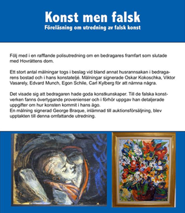 Mycket research behövs och konstgallerier olika länder kan vara inkopplade för att säkerställa äktheten av en tavla. Många bedragare är oerhört skickliga och har stor konstkännedom. Hon berättade om bedragare som t.ex kunde säga att ”jag har sålt ett 100-tals Amelin”. Hon beskrev initierat jakten på falska konstverk och det var inte alltid den som trodde att hen hade en äkta tavla och som visade upp den och fick en penseldrag draget över tavlan där det stod Falsk, blev så glad. Den tavlan finns numera på polismuseet. Att vara konstbedragare kan vara en lönsam affär. Vi fick veta att konstbedrägerier är den tredje största ekonomiska verksamhet vi har i Sverige men den är tyvärr inte så särskilt högt prioriterad av polisen. Att det var ett intressant föredrag vittnade många om och vi fick gå hem och titta på våra väggar.