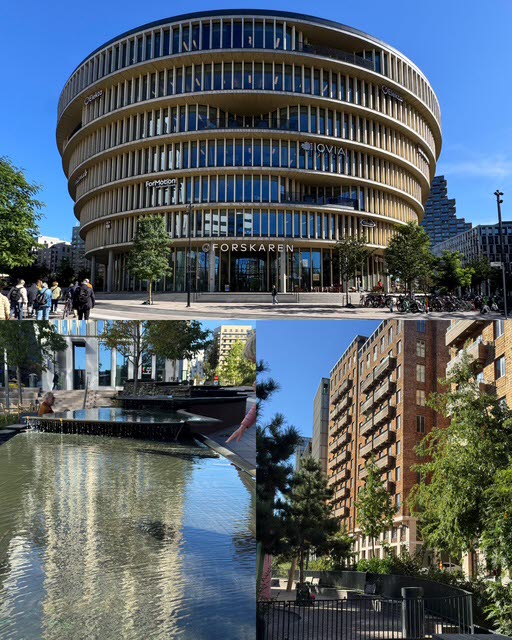 Visningen avslutades med en promenad genom området. Vi började med torget framför sjukhuset och tittade på den sk Vattentrappan, gick sedan igenom det runda huset Forskaren, som 2025 utsågs till Årets Stockholmsbyggnad. Camilla, vår kunniga och entusiastiska guide, pekade på en kvartett Winberg-ritade hus och några byggda i trä. Vi vandrade genom parken som till stor del ligger ovanpå den överdäckade motorvägen med fina lekplatser för barn och mycket, mycket grönska.