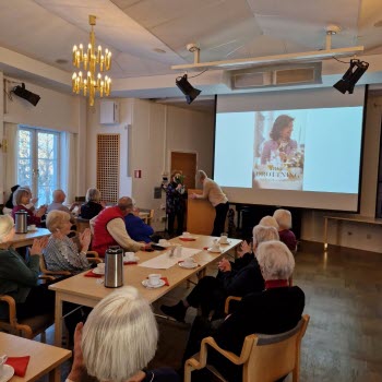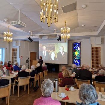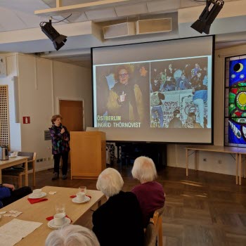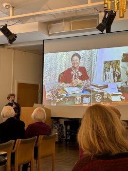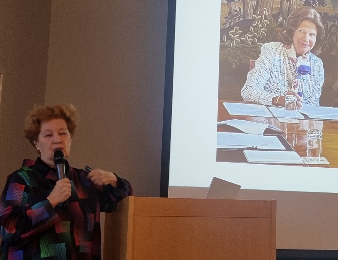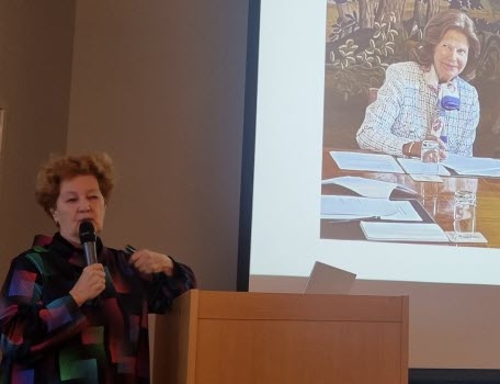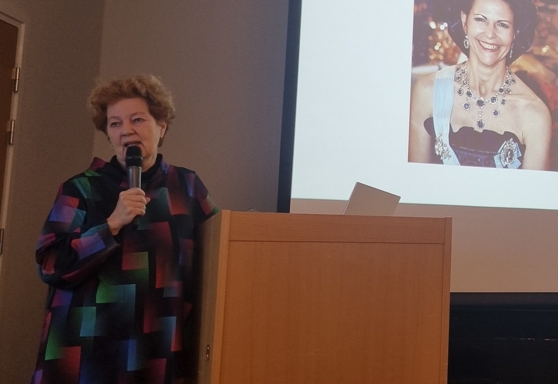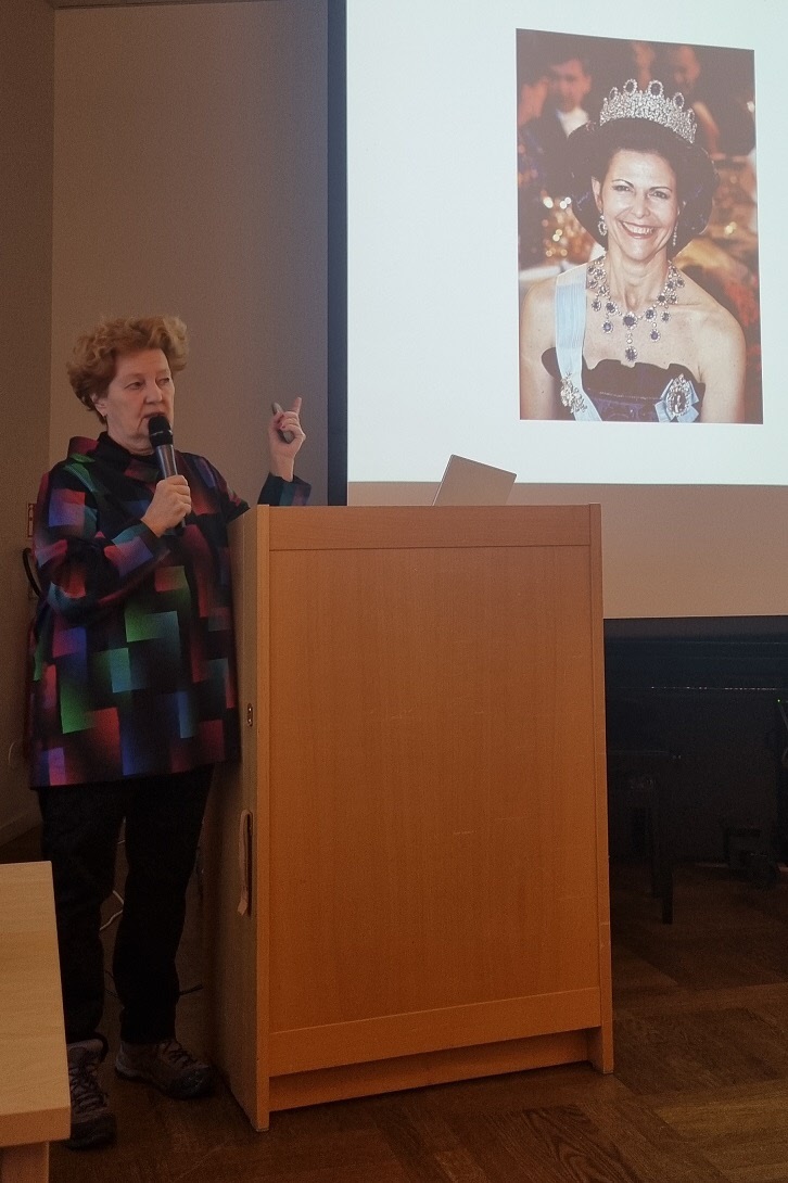 På månadsmötet den 16 januari berättade journalisten och f.d. utrikesreportern på SVT Ingrid Thörnqvist om sin bok Yrke : Drottning Makten och möjligheterna. Ingrid berättade tydligt och levande om sin tanke med boken, hur hon ville skriva en reportagebok om drottningens yrkesliv. Ingrid visade foton och tog oss med på en resa till drottningens organisationer Childhood, Silviahemmet och Mentor. Drottningen är ordförande, ledamot eller beskyddare av ca 200 olika organisationer. Silviahemmet utbildar certifierade undersköterskor som är en viktig grupp i arbetet med demenssjuka och eftersom drottningens mamma blev demenssjuk är det något som engagerar drottningen mycket. Drottningen skapade inte bara organisationerna utan engagerar sig i arbetet, deltar i insamlingsgalor, reser till konferenser utomlands, håller tal osv.