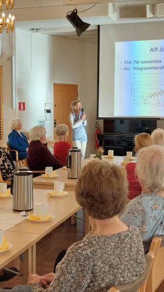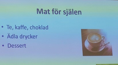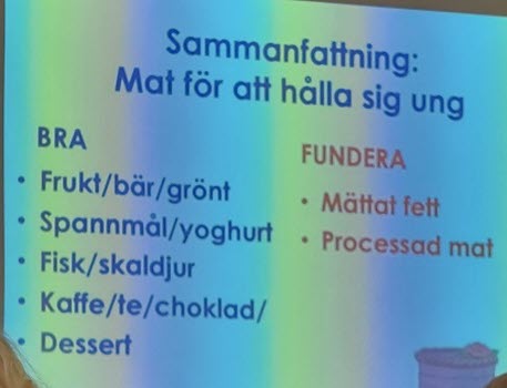 Vi fick lyssna på ett roligt, intressant och inspirerande föredrag av professor Charlotte Erlanson-Albertsson som tagit tåget upp från Lund för vår skull. Föredraget handlade om vikten av att äta bra i regnbågens färger, röra på oss och ha en optimist inställning. Tack till Mona Thunander som ordnade denna trevliga föreläsning med titeln “Man blir aldrig för mätt för en efterrätt”.